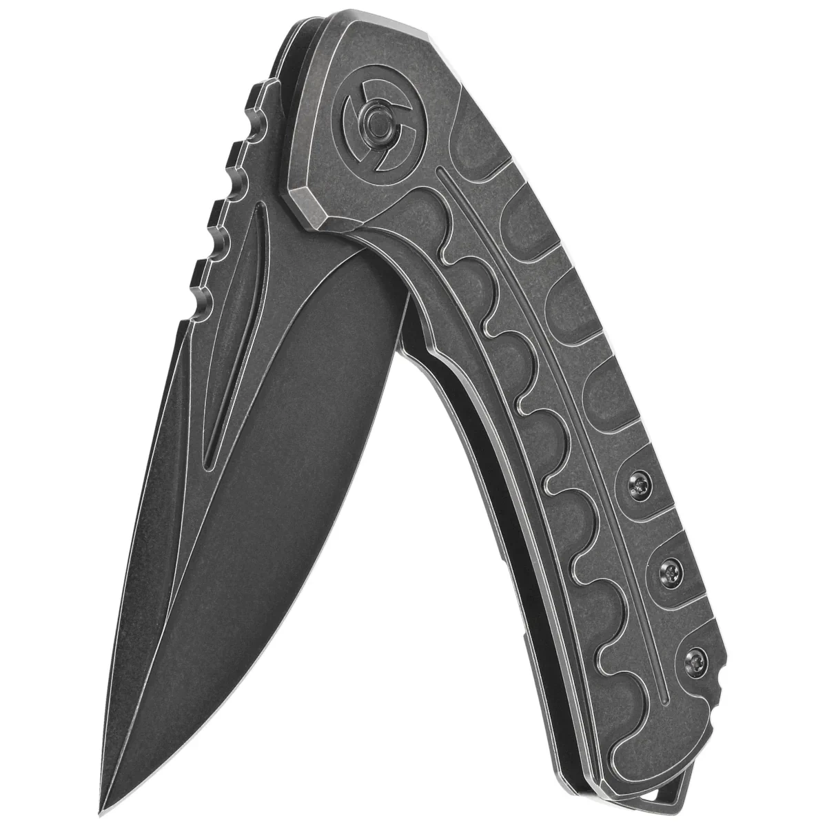 Głownia - typu Drop Point pokryta maskującą drobne metodą Black Stonewashed. Wydatny brzusiec wydłuża długość krawędzi tnącej w stosunku do długości klingi zbiegając się w kierunku ostrego jak igła czubka noża. Grubość klingi zapewnia wysoką wytrzymałość podczas gdy wysoki, płaski szlif daje doskonałą geometrię krawędzi tnącej oraz ekstremalną wydajność cięcia. Ceramiczne łożyska kulkowe wspomagają otwarcie ostrza za pomocą szybkiej płetwy flippera (index-finger flipper) po otwarciu pełniącej funkcję jelca. Nóź możemy również otworzyć przy użyciu wyfrezowanego wgłębienia w klindze (thumb slot). Fragment grzbietu klingi pokryto upper jimping, karbowanym oparciem pod kciuk ułatwiającym kontrolę nad nożem. Całość blokowana jest sprawdzoną i popularną blokadą frame lock ze stalową wkładką zabezpieczającą przed wycieraniem czoła blokady.