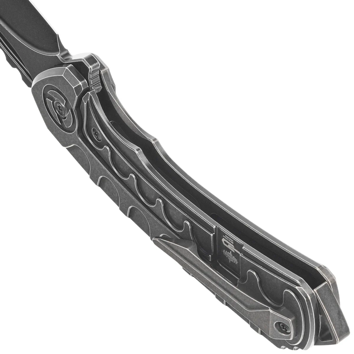 Rękojeść - to dwa kawałki litego tytanu 6AL4V. Fazowane krawędzie okładek eliminują ostre ranty dla wygody i poprawiają pewność uchwytu, dodatkowe zdobienie w kształcie łusek krokodyla. Masywny backspacer do którego przymocowano okładziny gwarantuje sztywność i wytrzymałość całej konstrukcji. Jednopozycyjny, prawostronny tytanowy klips umożliwia przenoszenie noża w pozycji tip-up, czubkiem ostrza ku górze. Wystająca część bacspacera tworzy otwór do przewleczenia linki asekuracyjnej lub ozdobnej, może również służyć jako zbijak do szyb.