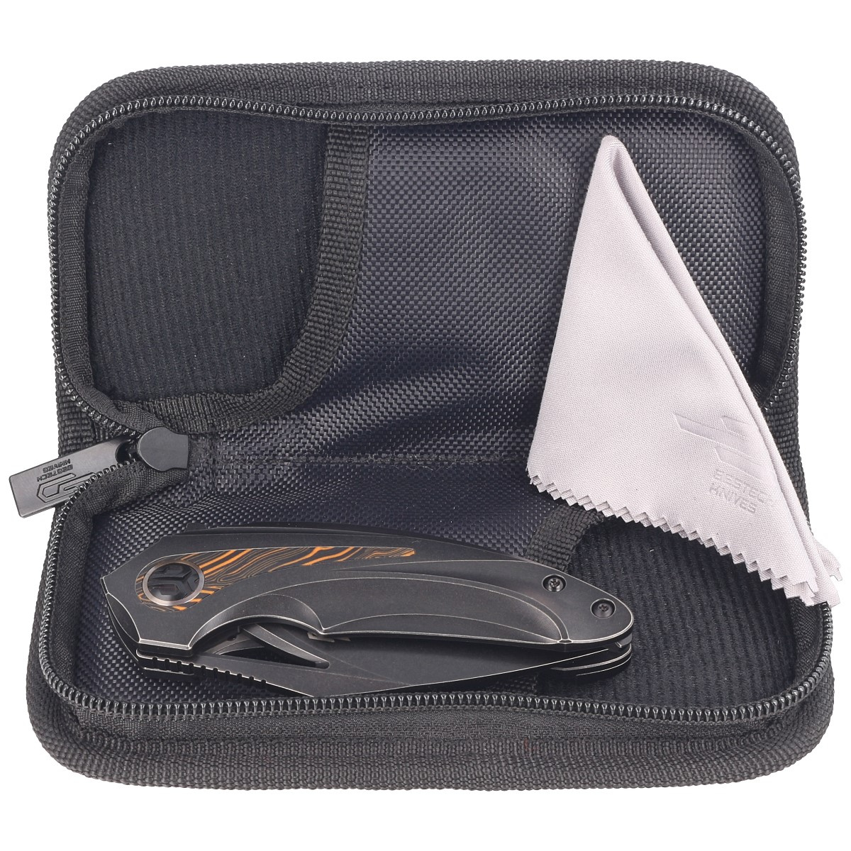 Futerał - nóż zapakowano w zapinany zamkiem nylonowy miękki pouch z logo marki służący do bezpiecznego przenoszenia i przechowywania foldera.