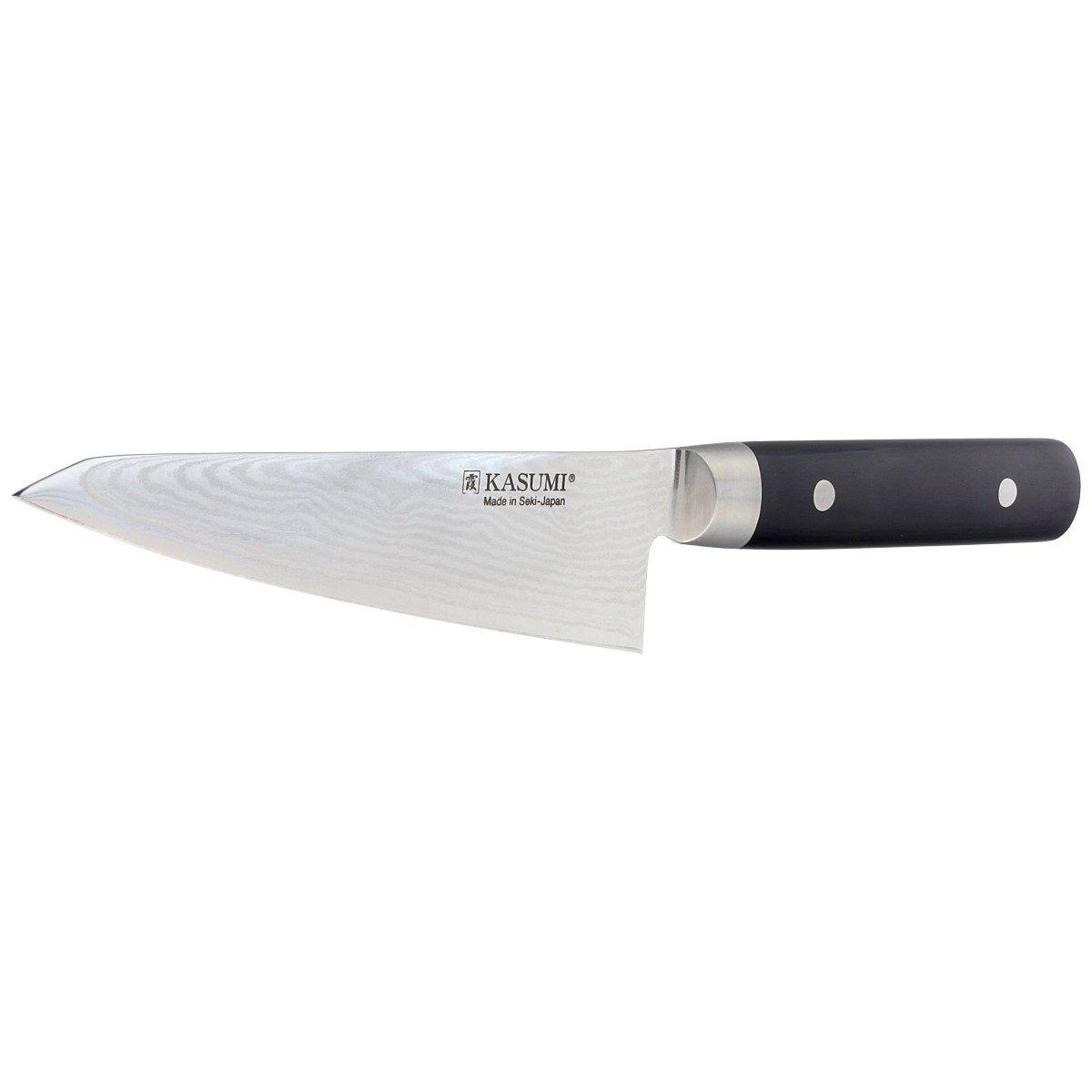 Damascus - najwyższa seria noży kuchennych Kasumi. Głownie wykonano ze stalowej "kanapki", w której twardy rdzeń z VG-10 otulony jest dwiema warstwami 32 warstwowego damastu ze stali nierdzewnej. Charakterystyczny wzór damastu powstaje poprzez skucie ze sobą wielu warstw stali, podobnie jak robiono to w japońskich mieczach.