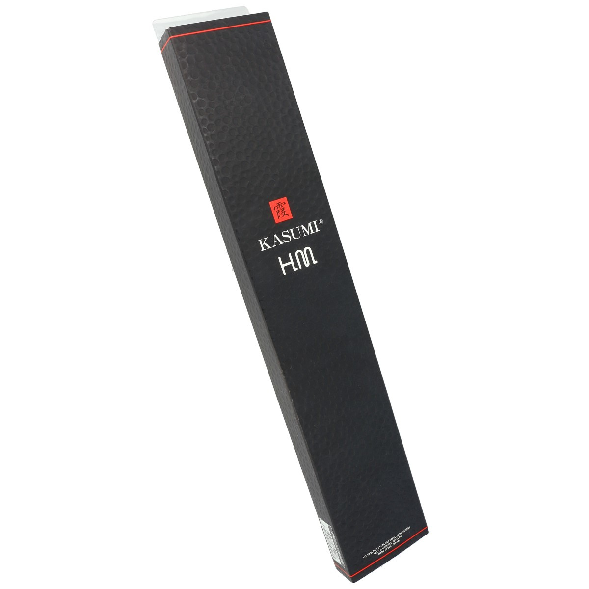 H.M. (Hammered) - w kolejności druga od góry rodzina noży kuchennych Kasumi. Głownie wykonano ze stalowej "kanapki", w której twardy rdzeń z VG-10 otulony jest dwiema warstwami miękkiej stali nierdzewnej. Charakterystyczny wzór młotka po obu stronach głowni to efekt kucia na gorąco przez 300 tonową maszynę, dzięki czemu stal jest mocniejsza, a ślady po kuciu doskonale widoczne.