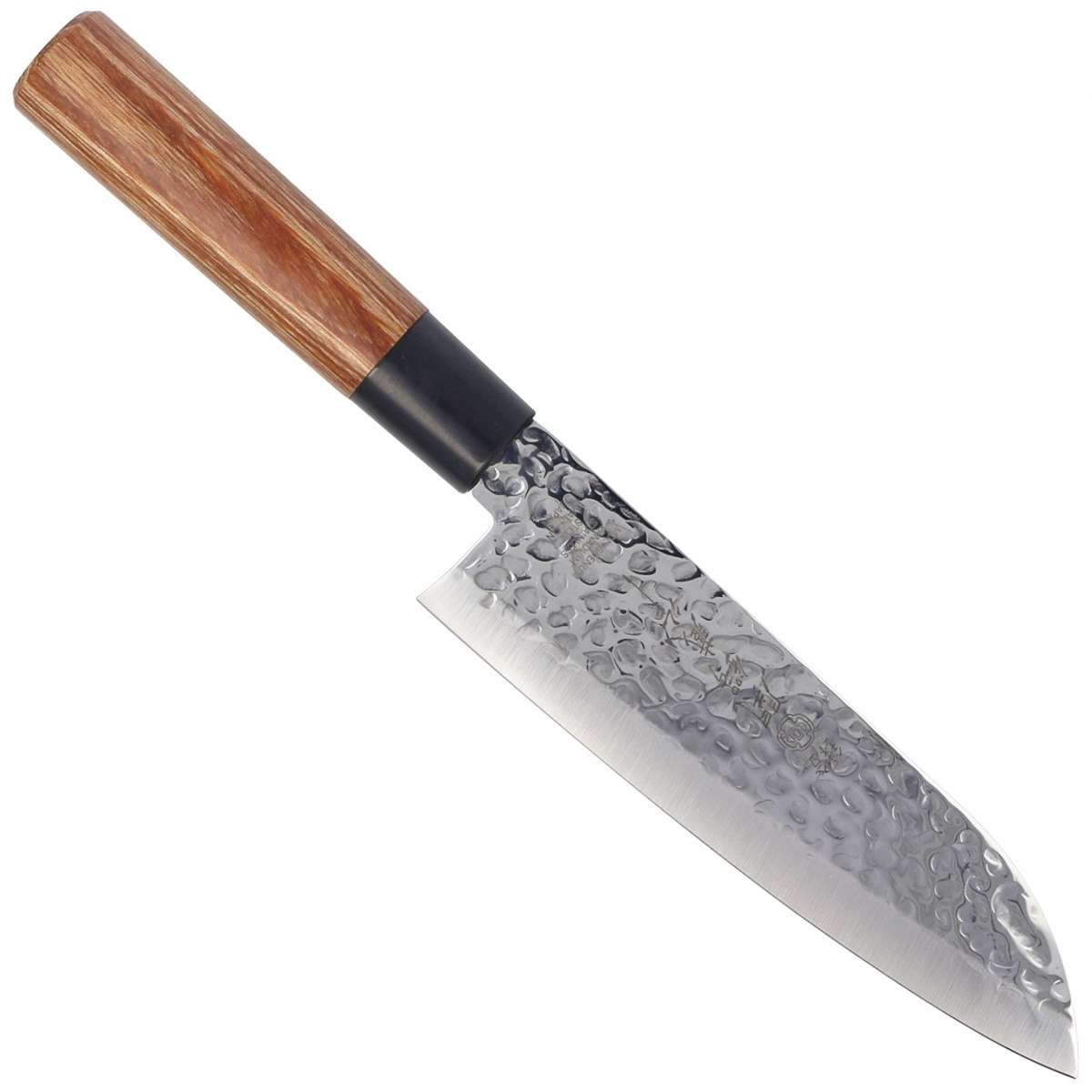 Tsubazo Santoku Pakka Wood, Tsuchime ze stali nierdzewnej Daido 1K6. Wykonany tymi samymi metodami co miecze samurajskie, z wygodną, okrągłą rękojeścią z drewna pakka, klinga wykończona efektowną metodą młotkowania - tsuchime. Uwaga!!! Bardzo ostre!!!