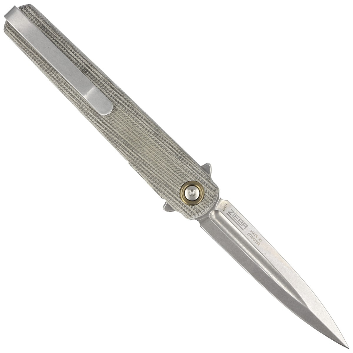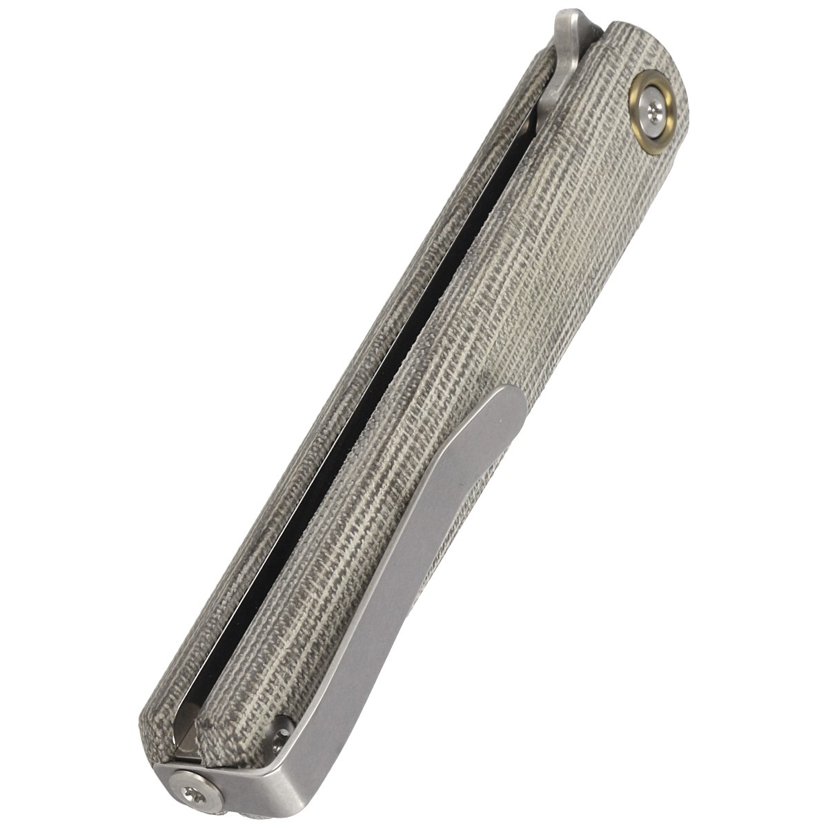 Rękojeść - z Canvas Micarty, materiału łączącego niską masę z wysoką odpornością na zużycie i warunki atmosferyczne. Lekko teksturowana powierzchnia zwiększa przyczepność, nawet w wilgotnym środowisku. Konstrukcja oparta na stalowych linersach skręconych przy pomocy dystansowej tulei zapewnia sztywność przy zachowaniu minimalnej wagi. Obustronny, głęboko osadzony deep carry clip umożliwia dyskretne przenoszenie foldera w kieszeni, zarówno przez użytkowników prawo-, jak i leworęcznych. Subtelny detal w postaci anodyzowanego pierścienia wokół pivota dodaje projektowi charakterystycznego akcentu. Folder dostarczany jest w miękkim etui z Cordury z zamkiem i opcją troczenia do paska – idealnym do bezpiecznego przenoszenia lub przechowywania. W zestawie znajdują się również klucze torx T6/T8.