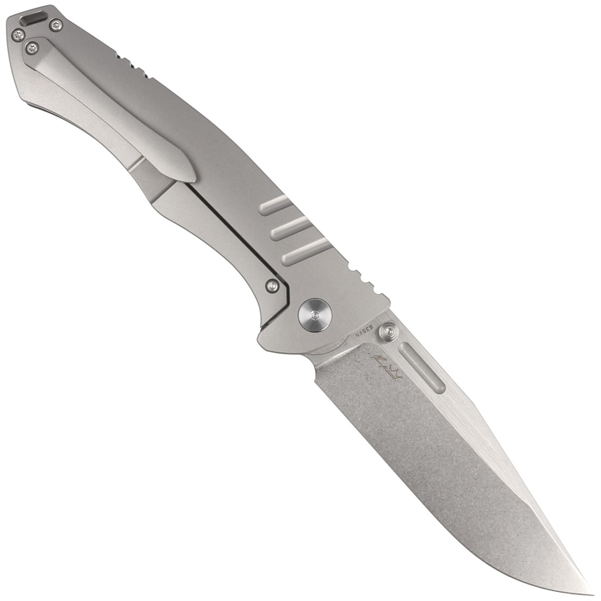 Rękojeść - strona reprezentacyjna wykonana z Marbled Carbon Fiber, strona blokady z litego tytanu 6AL4V. Fazowane krawędzie okładek eliminują ostre ranty dla wygody i poprawiają pewność uchwytu. Masywny tytanowy backspacer do którego przymocowano okładziny gwarantuje sztywność i wytrzymałość całej konstrukcji. Fragment grzbietu rękojeści pokryto upper jimping, karbowanym oparciem pod kciuk ułatwiającym kontrolę nad nożem. Jednopozycyjny, prawostronny tytanowy klips umożliwia przenoszenie noża w pozycji tip-up, czubkiem ostrza ku górze.