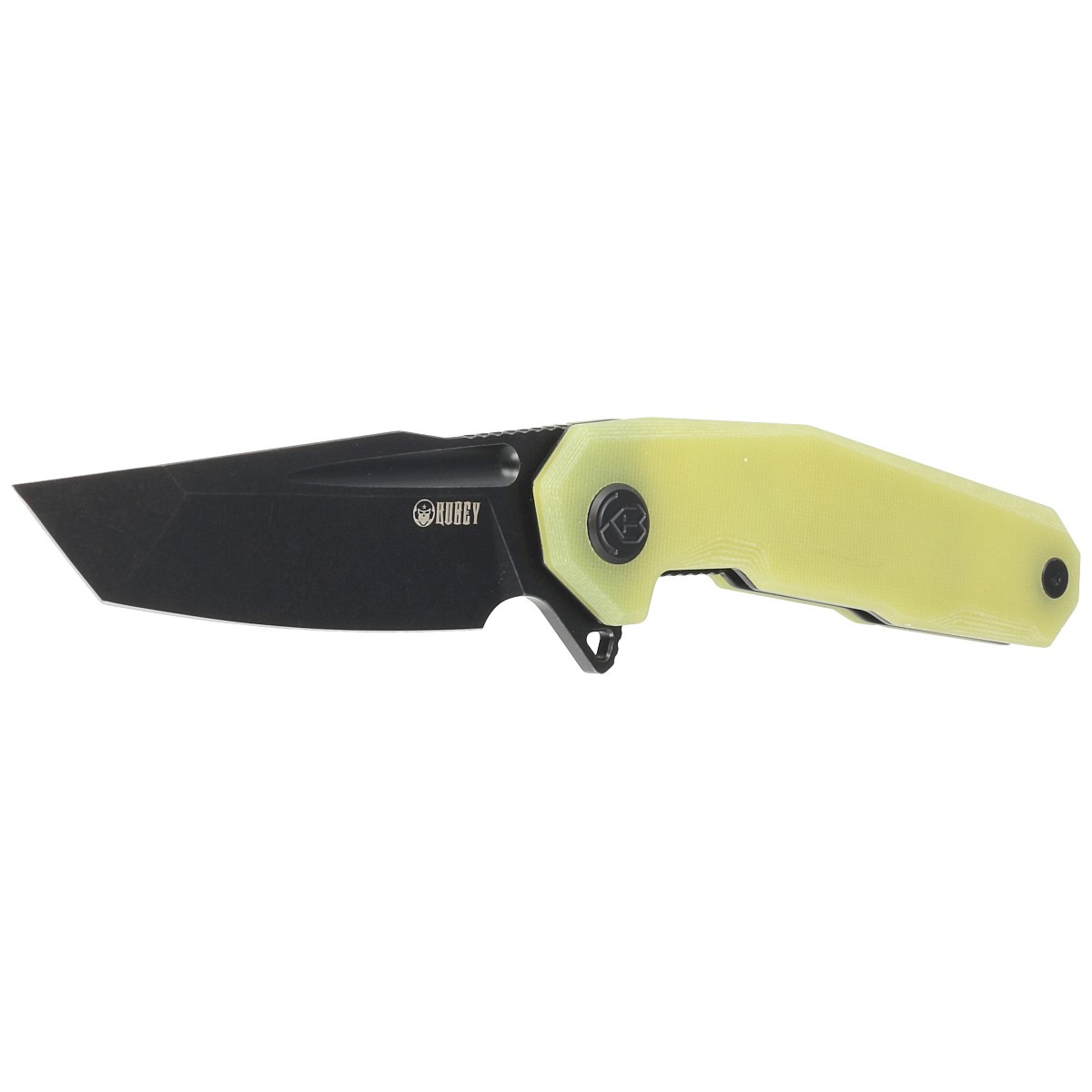 Rękojeść - okładziny z przezroczyście żółtego kompozytu G10 (włókno szklane prasowane pod ciśnieniem z syntetyczną żywicą), teksturowane dla poprawienia pewności uchwytu, przykręcono do stalowej ramy noża. Otwarta konstrukcja tzw. open-backed mocowana do siebie stalowymi tulejami dystansowymi zmniejsza wagę oraz ułatwia czyszczenie. Prosta, solidna konstrukcja daje pewność wieloletniego użytkowania. Głębokie, profilowane podcięcie na palec (fore finger groove) poprawia pewność uchwytu. Oś pivota zdobi stylizowane logo marki Kubey Knife. Jednopozycyjny (prawostronny) metalowy klips deep carry pozwala przenosić dyskretnie nóż w kieszeni w pozycji tip-up (czubkiem ostrza do góry).