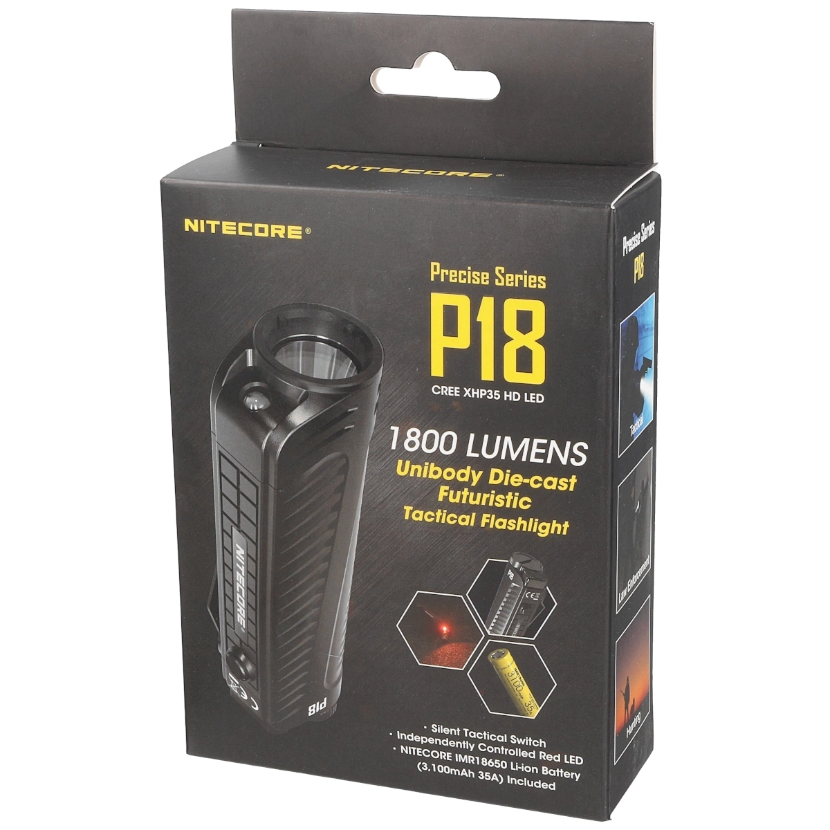 - Latarka NiteCore P18 przenosi serię Precision na wyższy poziom, dzięki zastosowaniu odlewu aluminiowego, cichego włącznika i czerwonej diody LED. Wyposażona w diodę CREE XHP35 HD LED, P18 jest w stanie osiągnąć niesamowicie wysoką jasność 1800 lumenów!