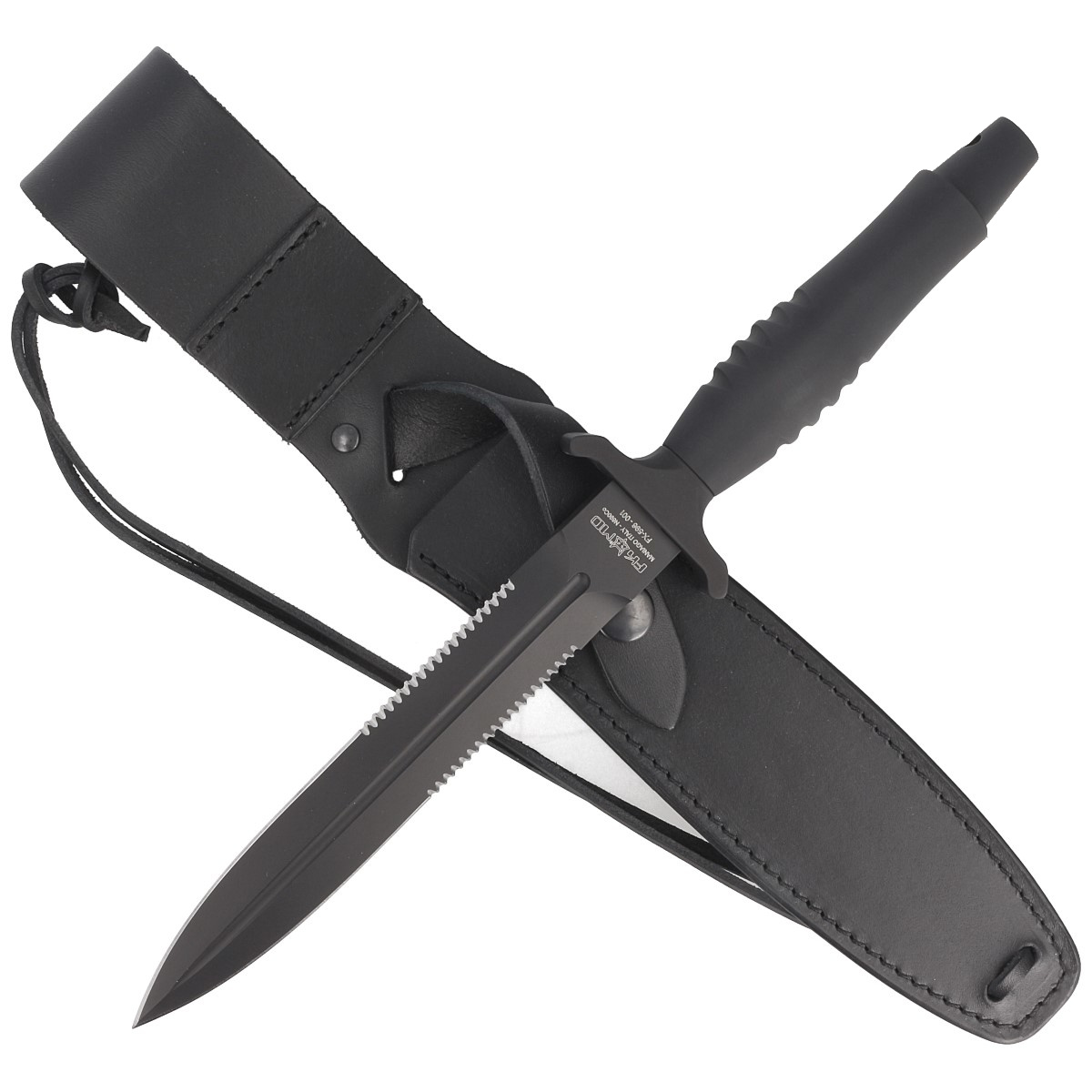 Pochwa - z wysokiej jakości skóry, z uchem do zawieszenia na pasie. Skórzany pasek zapinany na zatrzask zabezpiecza nóż przed wypadnięciem. W dolnej części otwór do przewleczenia linki udowej.