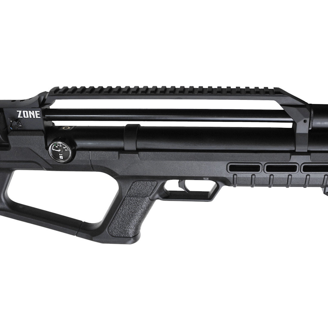 - Zone wiatrówka PCP o regulowanej mocy strzału w znanej z przesunięcia komory i magazynika za spust wersji bullpup. Poprzez zastosowanie układu bezkolbowego uzyskano kompaktowe wymiary karabinu przy zachowaniu gwarantującej celność normalnej długości lufy