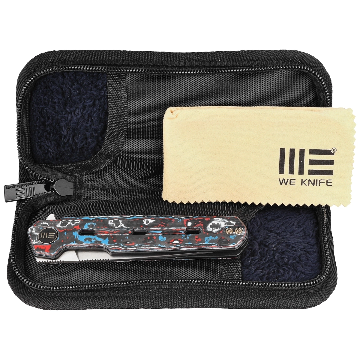 Rękojeść - okładziny z Nebula Fat Carbon Fiber (kolorowe włókno węglowe prasowane pod ciśnieniem z żywicą syntetyczną) mocowane do linersów z tytanu 6AL4V. Fazowane krawędzie okładek eliminują ostre krawędzie. Okładziny przykręcono do misternie obrobionego tytanowego backspacera, dając pewność wieloletniego użytkowania. Oś pivota zdobi stylizowane logo marki WE Knife. Dwupozycyjny (prawa/lewa) tytanowy klips deep carry pozwala przenosić dyskretnie nóż w kieszeni w pozycji tip-up (czubkiem ostrza do góry). Z tyłu rękojeści lanyard hole, ukryte w backspacerze miejsce na linkę ozdobną lub zabezpieczającą.