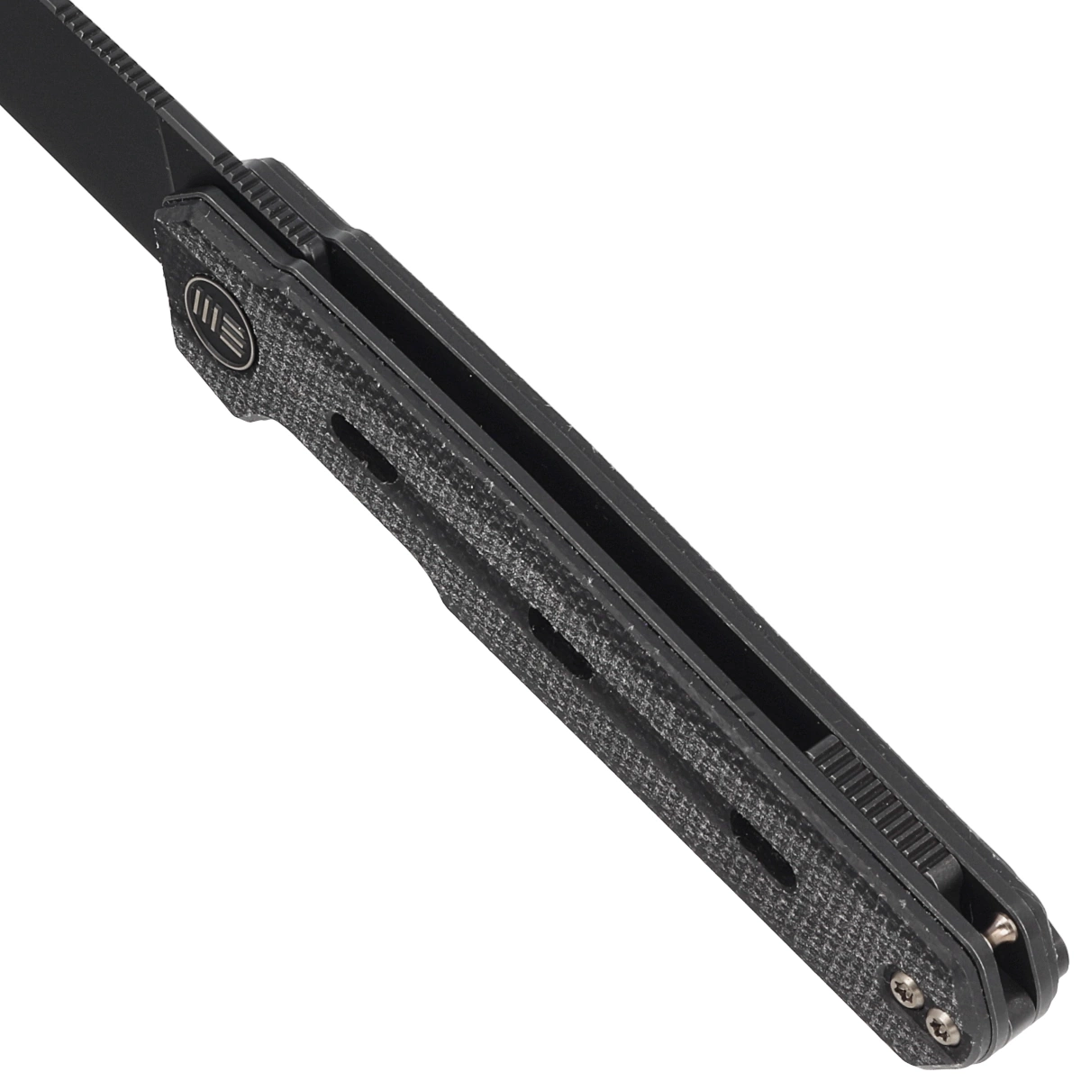 Rękojeść - okładziny z Canvas Micarty (płótno prasowane pod ciśnieniem z żywicą syntetyczną) mocowane do linersów z tytanu 6AL4V. Fazowane krawędzie okładek eliminują ostre krawędzie. Okładziny przykręcono do misternie obrobionego tytanowego backspacera, dając pewność wieloletniego użytkowania. Oś pivota zdobi stylizowane logo marki WE Knife. Dwupozycyjny (prawa/lewa) tytanowy klips deep carry pozwala przenosić dyskretnie nóż w kieszeni w pozycji tip-up (czubkiem ostrza do góry). Z tyłu rękojeści lanyard hole, ukryte w backspacerze miejsce na linkę ozdobną lub zabezpieczającą.