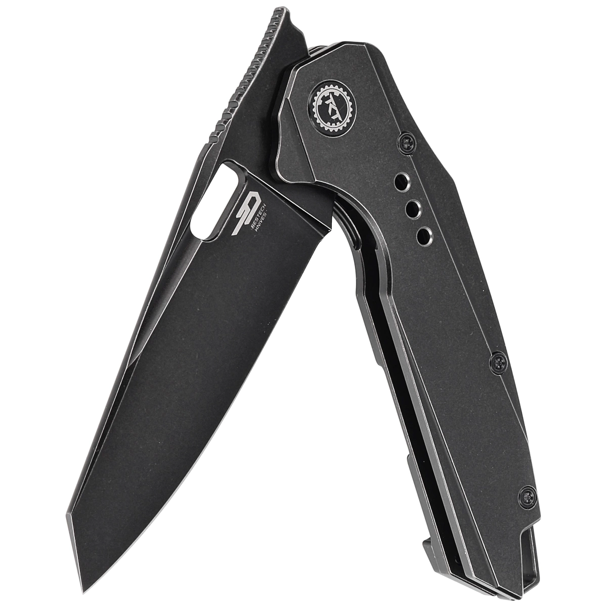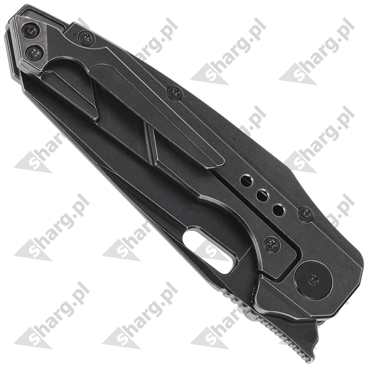 Głownia - szeroka, typu Reverse Tanto z maskującym rysy wykończeniem Stonewashed, pokrytym nastepnie czarną powłoką. Łagodna krzywizna krawędzi tnącej zbiega się w kierunku ostrego jak igła czubka noża. Grubość klingi zapewnia wysoką wytrzymałość podczas gdy wysoki, płaski szlif daje doskonałą geometrię krawędzi tnącej oraz ekstremalną wydajność cięcia. Dodatkowym wzmocnieniem jest długie zbrocze. Ceramiczne łożyska kulkowe wspomagają otwarcie ostrza za pomocą szybkiej płetwy front flippera (index-finger front flipper). Nóź możemy również otworzyć przy użyciu otworu w klindze (thumb hole). Całość blokowana jest sprawdzoną i popularną blokadą frame lock ze stalową wkładką zabezpieczającą przed wycieraniem czoła blokady.