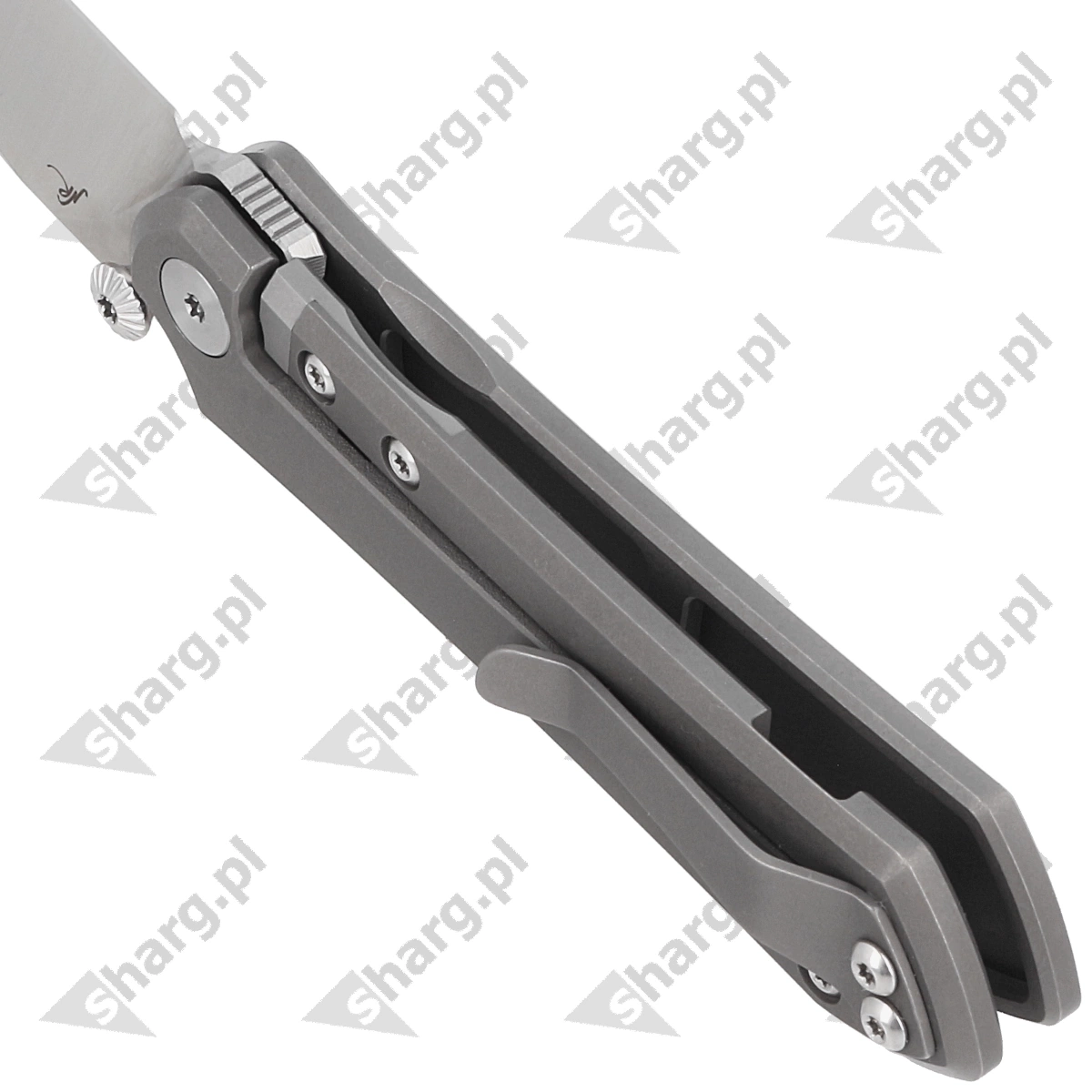 Rękojeść - to dwa kawałki litego tytanu 6AL4V wykończone metodą Dark Stonewashed. Ergonomicznie profilowane, eliminują ostre ranty dla wygody, nacięcia wykonane w okładzinie poprawiają pewność uchwytu. Otwarta konstrukcja tzw. open-backed bez typowego backspacera, mocowana do siebie stalowymi tulejami dystansowymi ułatwia czyszczenie. Jednopozycyjny, prawostronny tytanowy klips umożliwia przenoszenie noża w pozycji tip-up, czubkiem ostrza ku górze.