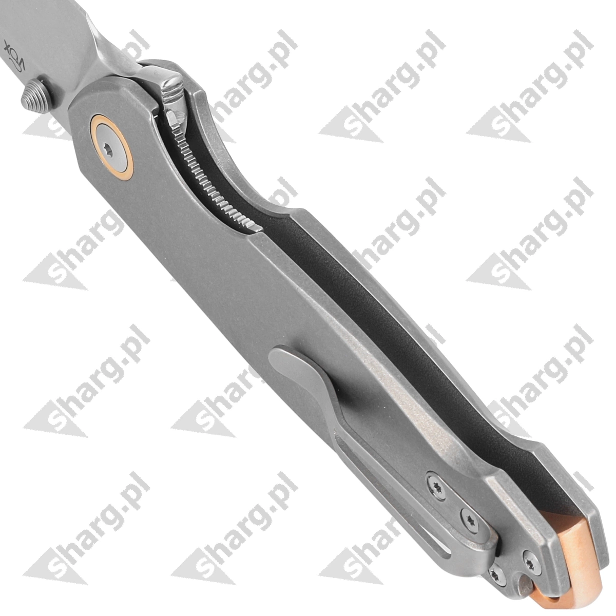 Rękojeść - okładziny z piaskowanego tytanu połączone ze sobą przy pomocy frezowanego obrabiarkami CNC backspacera, dzięki czemu nóż zachowuje pożądaną sztywność konstrukcji. Backspacer oraz ozdobny pierścień wokół pivota tzw. pivot collar wykonano z brązu fosforowego (phosphor bronze). Wykonane z przodu podcięcie na palce (fore finger groove) poprawia pewność uchwytu, tworząc jednocześnie z flipperem gardę zapobiegającą ześlizgnięciu się dłoni na ostrze. Prawostronny, jednopozycyjny tytanowy klips deep carry, pozwala przenosić dyskretnie nóż w pozycji tip-up (czubkiem do góry). Na końcu rękojeści lanyard hole, otwór na linkę.