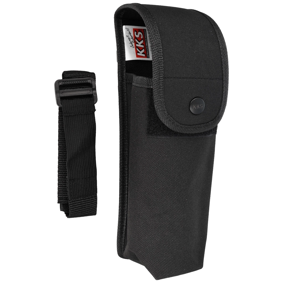 Profesjonalna udowa kabura policyjna niemieckiej firmy KKS. Przeznaczona do przenoszenia ręcznych gazów RSG Police marki Vesk o pojemności do 400 ml wyposażonych w Policyjną Głowicę Pistoletową. Ładownica stworzona na potrzeby służb mundurowych (oddziałów prewencji policji), stawia na bezpieczeństwo. Zabezpiecza pojemnik przed uszkodzeniem, nie ma tendencji przemieszczania się na pasie.