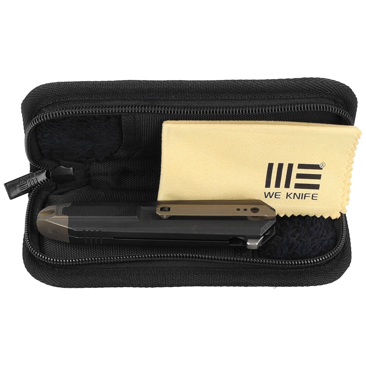Rękojeść - to popis innowacyjności inzynierskiej projektantów z WeKnife. Dwa kawałki tytanu 6AL4V, pięknie frezowane łączy na końcu tytanowa nasadka z jednego kawałka tytanu. Dzięki temu rękojeść zachowuje niebywałą sztywność i odporność. Tylko nieliczne firmy są w stanie wykonać rękojeść z tak nieprawdopodobną dokładnością! Kolejna innowacja to umieszczone symetrycznie po obu stronach noża klipsy do przenoszenia. Koniec z odkręcaniem śrubek i przekładaniem, nóż możemy nosić po prawej i lewej stronie w tej samej pozycji. Dodatkowym smaczkiem jest zakończenie klipsów rolką, dzięki czemu ułatwione jest wsuwanie i zaczepianie noża o brzeg materiału. Nasadka i klipsy w kontrastującym do czerni kolorze brązu.
