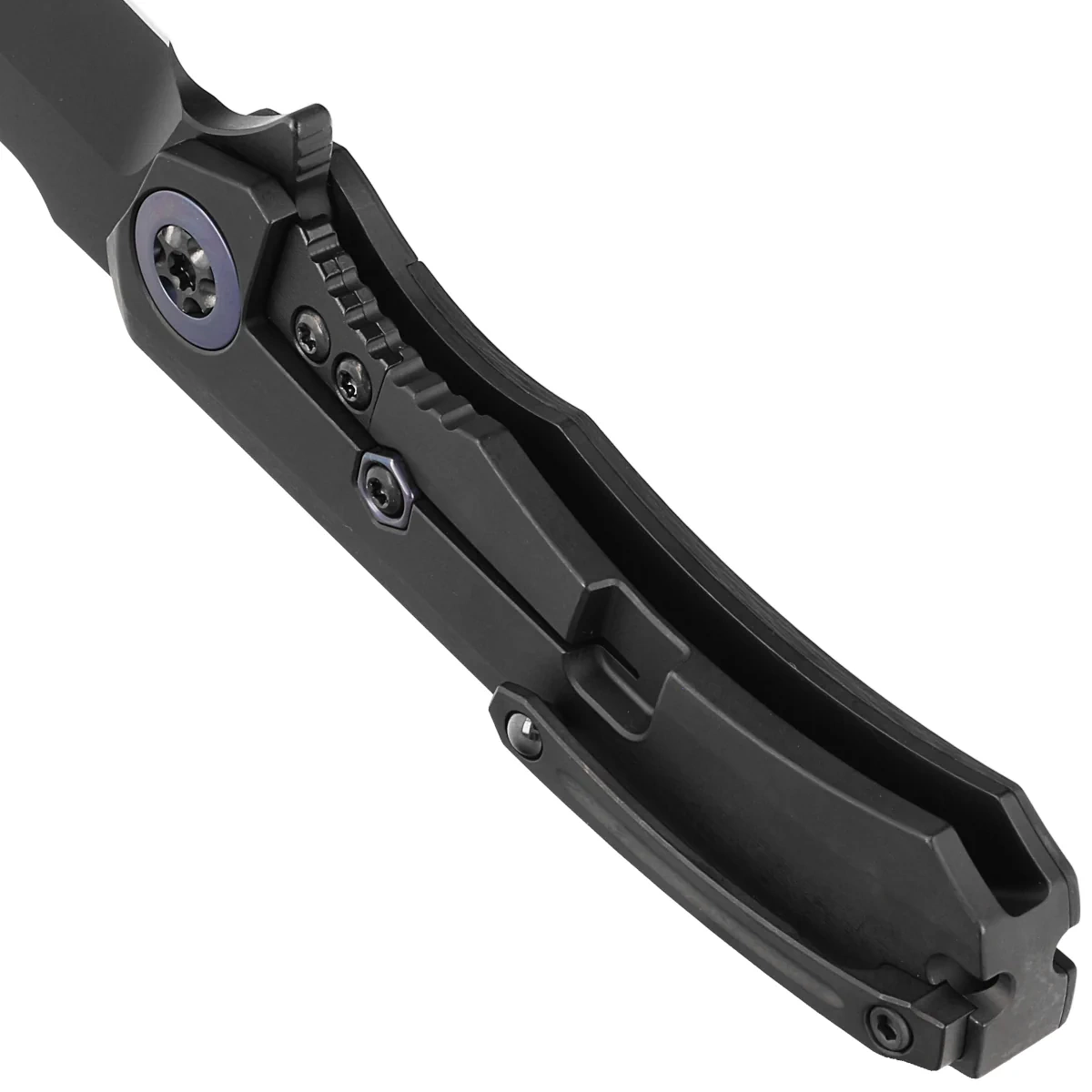 Głownia - szeroka, typu Drop Point S/E (Single Edge), trwałość powierzchni zwiększono czarną powłoką DLC z wykończeniem Battleworn. Wydatny brzusiec wydłuża długość krawędzi tnącej w stosunku do długości klingi zbiegając się w kierunku ostrego jak igła czubka. Solidna grubość ostrza w połączeniu z wysokim płaskim szlifem (Flat Grind) daje doskonałe właściwości tnące połączone z wysoką wytrzymałością. Nóż można otworzyć za pomocą płetwy flippera (index-finger flipper). Aby zachować pełną kontrolę nad ostrzem, na grzbiecie klingi upper jimping, karbowane oparcie pod kciuk. Całość blokowana jest sprawdzoną i popularną blokadą frame lock ze stalową wkładką zabezpieczającą przed wycieraniem czoła blokady.