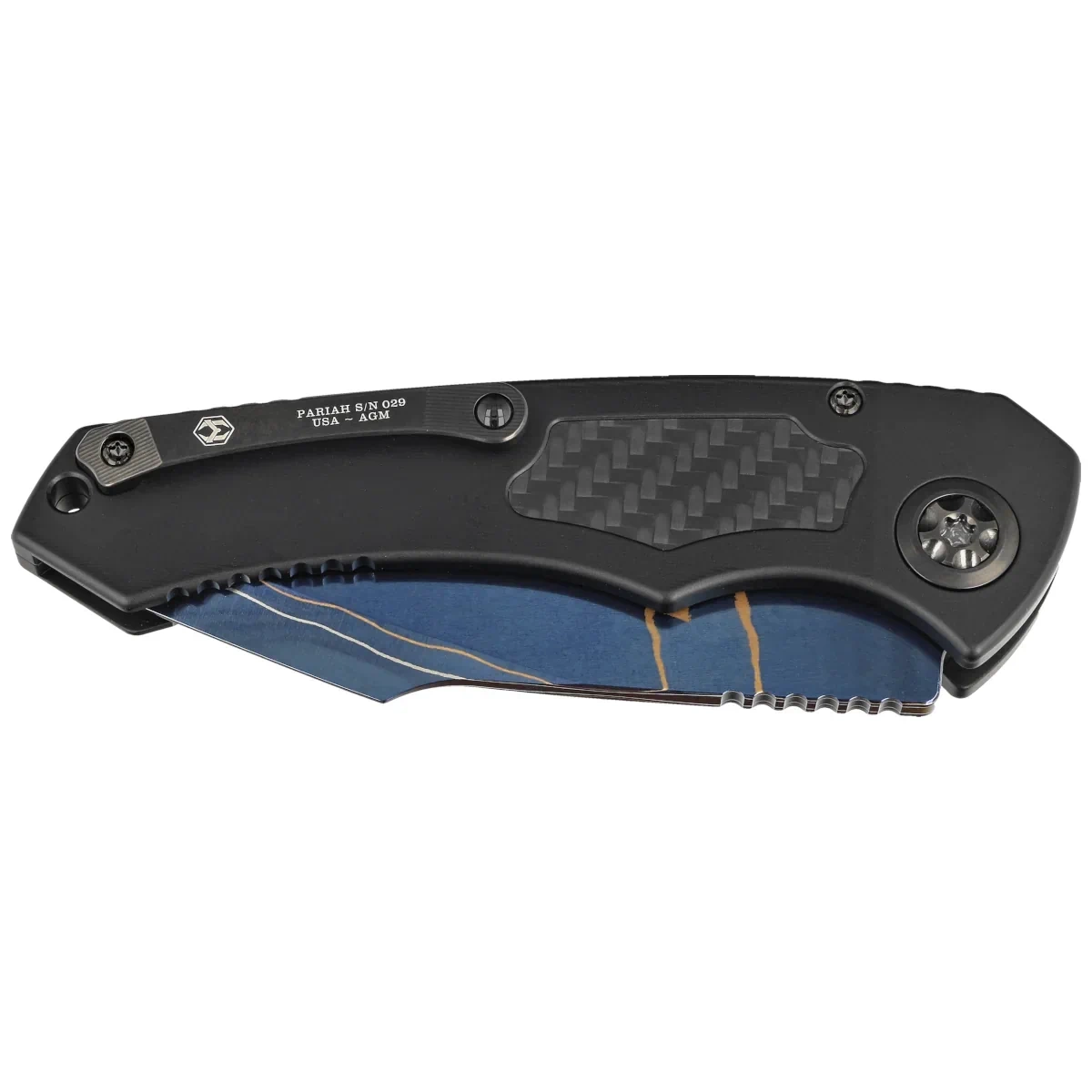 - Pariah-Auto Custom DLC Aluminium / Carbon Fiber Inlays, Blued Baker Forge AuroraMai Damascus S/N 029. Limitowana edycja noża automatycznego Pariah, zaprezentowana na wystawie USN 2023! Absolutny top niezwykłych materiałów w perfekcyjnym wykonaniu!