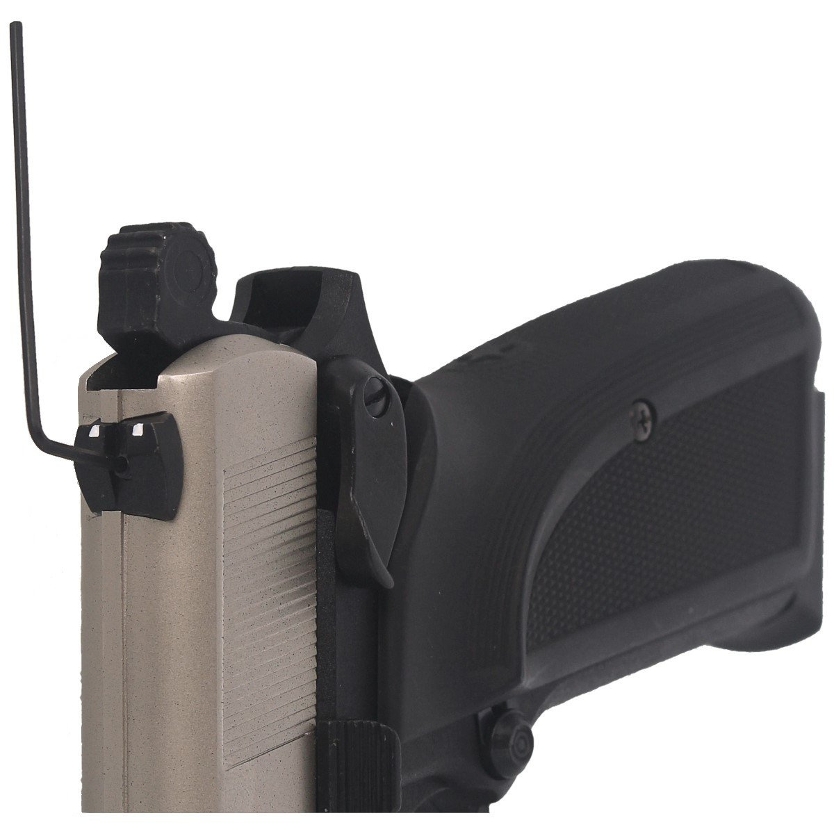 Przyrządy celownicze - polimerowe, stała muszka oraz regulowana szczerbinka. Naniesione plamki w białym kontrastującym kolorze ułatwiają celowanie w warunkach ograniczonej widoczności.