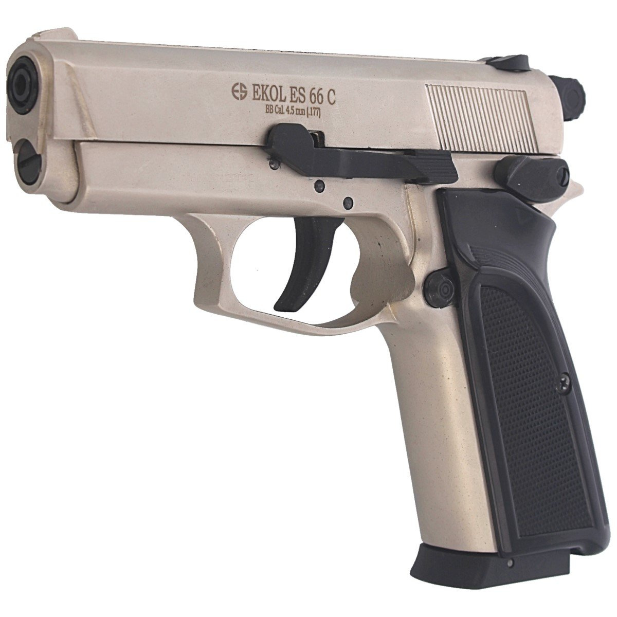 - Ekol ES 66C Satyna - kompaktowy, samopowtarzalny pistolet pneumatyczny oparty konstrukcyjnie na broni sygnałowej. Dzięki silnym korzeniom, ta mocna wiatrówka 140 m/s nadaje się do dynamicznego strzelectwa i treningu taktycznego. Metalowy szkielet.