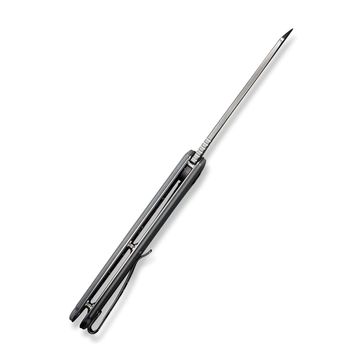 Głownia - typu Wharncliffe o prostej krawędzi tnącej, wykończona eleganckim satynowaniem. Niewielka grubość klingi w połączeniu z wysokim, płaskim szlifem daje doskonałą geometrię krawędzi tnącej oraz ekstremalną wydajność cięcia. Ceramiczne łożyska kulkowe wspomagają płynną pracę mechanizmu otwierającego klingę, którą można otworzyć za pomocą szybkiej płetwy flippera (index-finger flipper). Po otwarciu płetwa tworzy mini-gardę zapobiegającą ześlizgnięciu się dłoni na ostrze. Na grzbiecie klingi upper jimping, karbowane oparcie pod kciuk. Całość blokowana jest solidną blokadą liner lock.