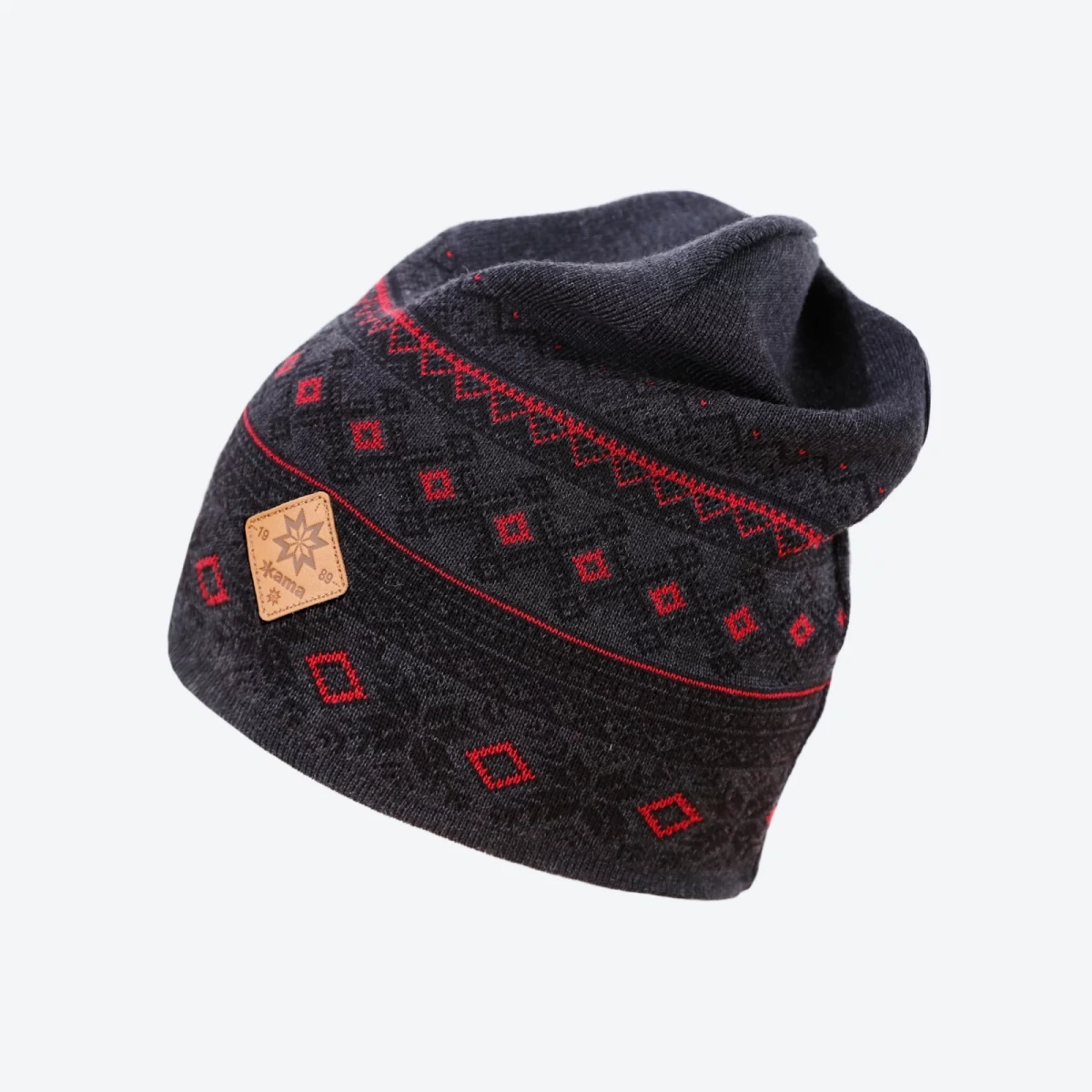 AW143-111 (Graphite) ciepła, antyalergiczna czapka z wzorem w stylu nordyckim ze 100% wełny merynosów Schoeller z opaską z odprowadzającą wilgoć opaską Polycolon®. Zastosowanie 100% wełny merino i Polycolon® chroni przed zimnem, wiatrem, śniegiem, a jednocześnie odprowadza nadmiar wilgoci na zewnątrz zapewniając idealną termoregulację nawet gdy jest zawilgocona.
