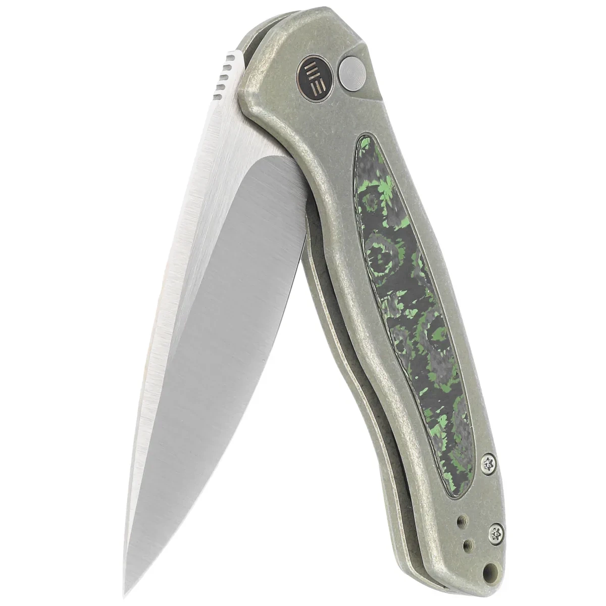 Nóż składany WE Knife Button Lock Kitefin LE No 103/157 Green Titanium/Jungle Wear Fat Carbon, Hand Polished Satin CPM 20CV (WE19002N-2)