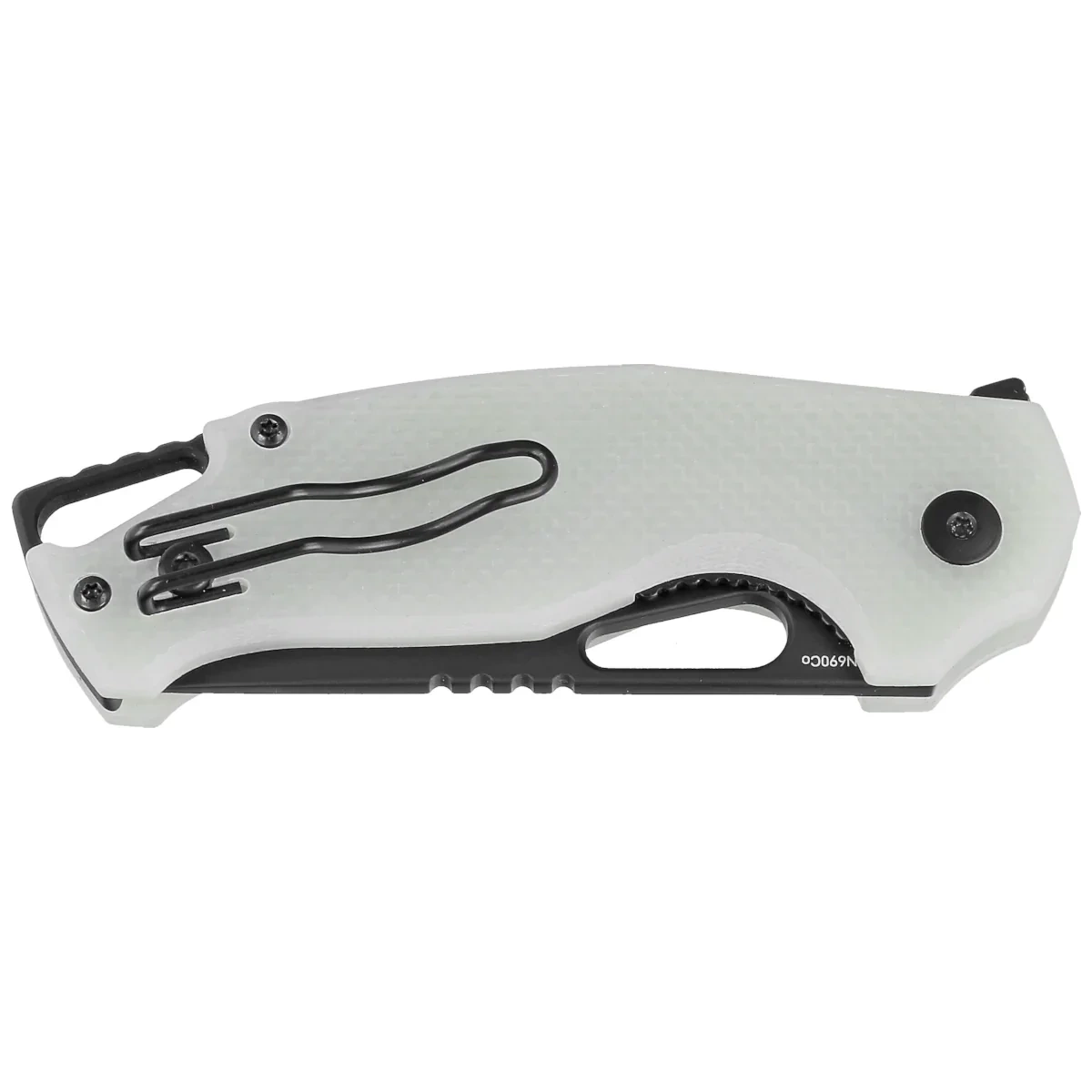 Rękojeść - okładziny z lekko szorstkiego G10, kompozytu włókna szklanego prasowanego pod ciśnieniem z żywicą syntetyczną. Okładziny przykręcono do frezowanego obrabiarkami CNC backspacera z aluminium, takie rozwiązanie zapewnia pożądaną sztywność konstrukcji. Obustronny (prawa/lewa) klips deep carry, pozwala przenosić dyskretnie nóż w pozycji tip-up (czubkiem ostrza do góry). Wystający fragment backspacera tworzy lanyard hole, otwór na linkę, można go również użyć jako improwizowany zbijak do szkła.
