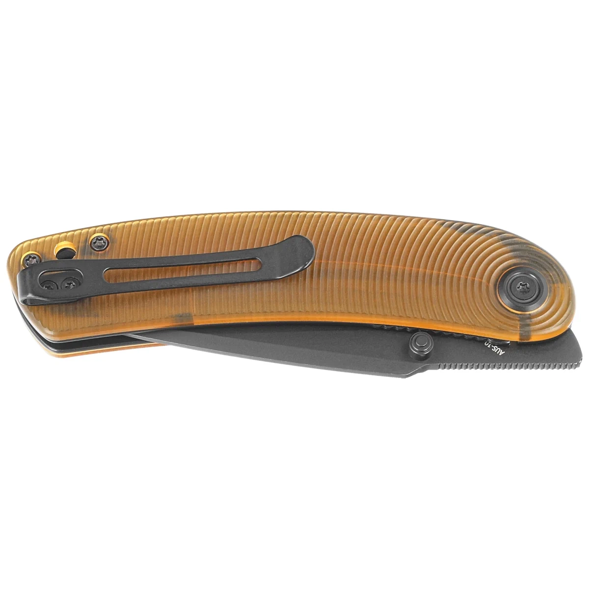Rękojeść - okładziny z przezroczystego tworzywa Ultem™, teksturowane dla poprawienia pewności uchwytu, przykręcono do stalowej ramy noża. Otwarta konstrukcja tzw. open-backed bez typowego backspacera, mocowana do siebie stalowymi tulejami dystansowymi ułatwia czyszczenie. Prosta, solidna konstrukcja daje pewność wieloletniego użytkowania. Pivot ozdobiony stylizowanym logo producenta. Dwupozycyjny (prawa/lewa) stalowy klips deep carry pozwala przenosić dyskretnie nóż w kieszeni w pozycji tip-up (czubkiem ostrza do góry). Nad klipsem lanyard hole, otwór do przewleczenia linki zabezpieczającej lub ozdobnej.