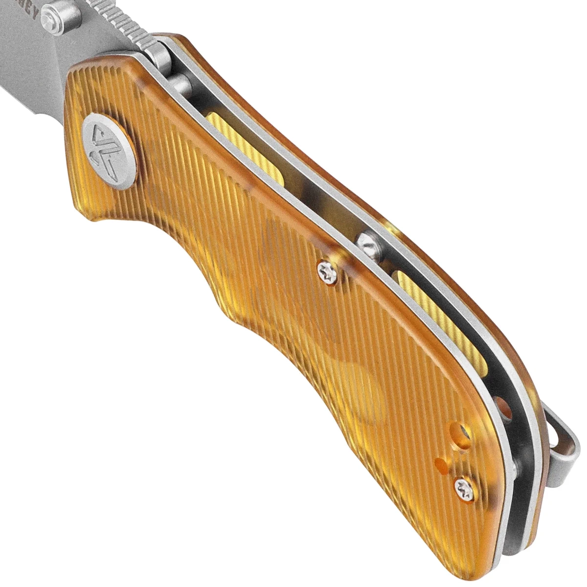 Rękojeść - okładziny z przezroczystego tworzywa Ultem™, teksturowane dla poprawienia pewności uchwytu, przykręcono do stalowej ramy noża. Otwarta konstrukcja tzw. open-backed mocowana do siebie stalowymi tulejami dystansowymi zmniejsza wagę oraz ułatwia czyszczenie. Prosta, solidna konstrukcja daje pewność wieloletniego użytkowania. Oś pivota zdobi stylizowana śruba z logo marki. Dwupozycyjny (lewo/prawostronny) metalowy klips deep carry pozwala przenosić dyskretnie nóż w kieszeni w pozycji tip-up (czubkiem ostrza do góry) Nad klipsem lanyard hole, otwór do przewleczenia linki zabezpieczającej lub ozdobnej.