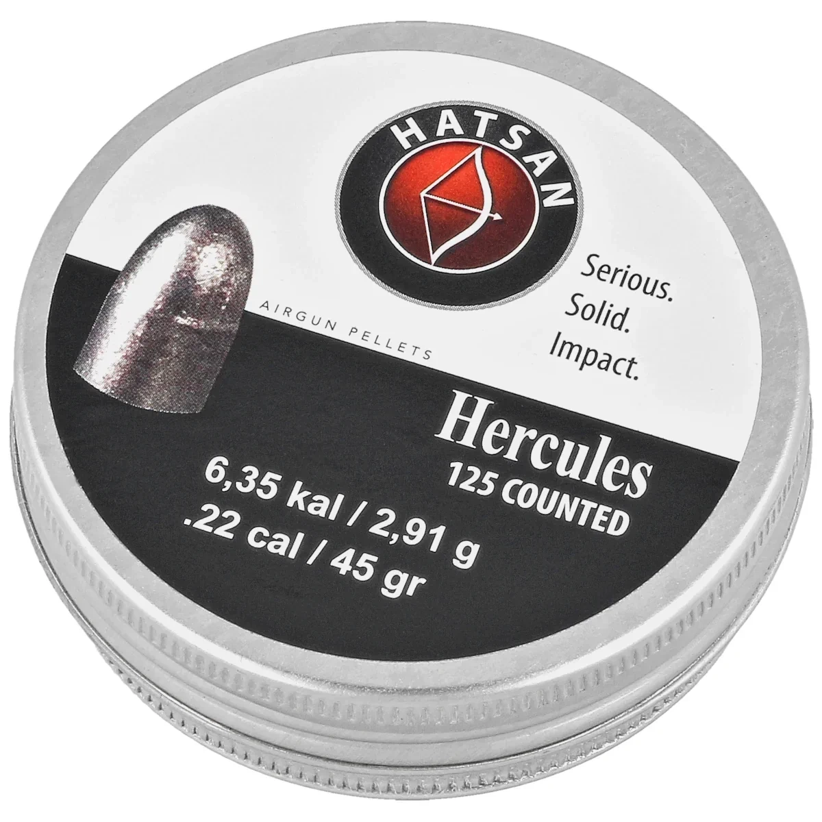 - Hatsan Hercules 45 gr precyzyjny śrut w kal. 6.35mm. Zaprojektowany do najmocniejszych karabinów w wersji FAC do celnego strzelania na dużych odległościach (nie wrażliwy na podmuchy wiatru) 50m, 100m, a nawet 200 metrów. Korzystny współczynnik balistyczny