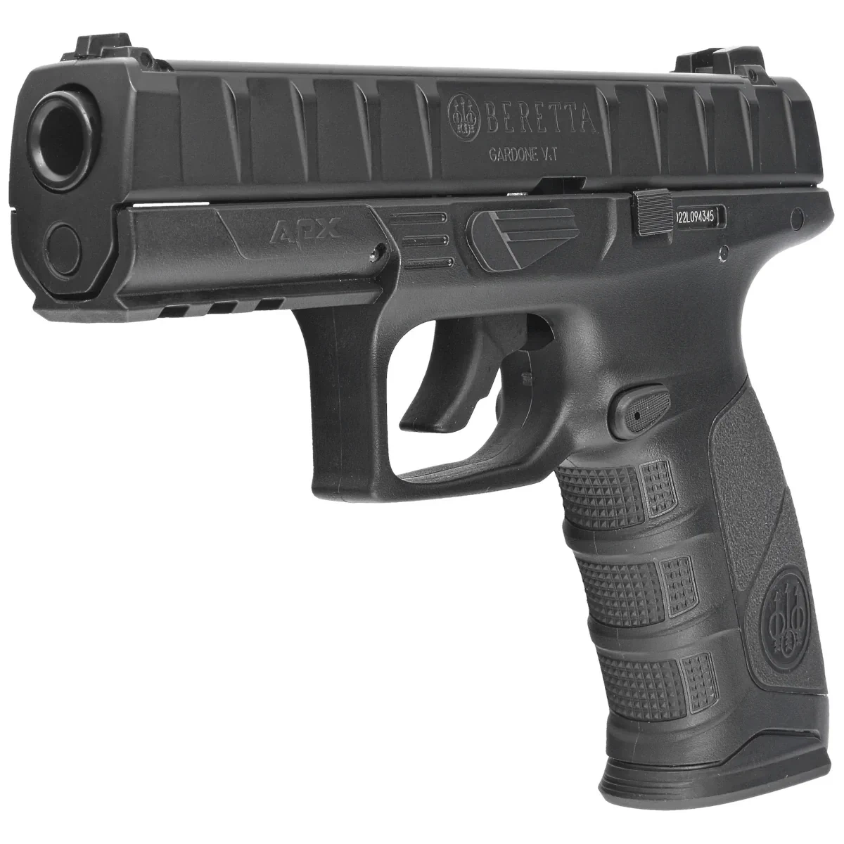 Pistolet Beretta APX zasilany jest kapsułą CO2 12 g, montowaną w rękojeści. Montaż i wymiana kapsuły są proste i wygodne. Pistolet osiąga prędkość początkową do 120 m/s, co przekłada się na celny zasięg w granicach 30 m. Jedna kapsuła pozwala na oddanie około 60 strzałów z wyrównaną prędkością.