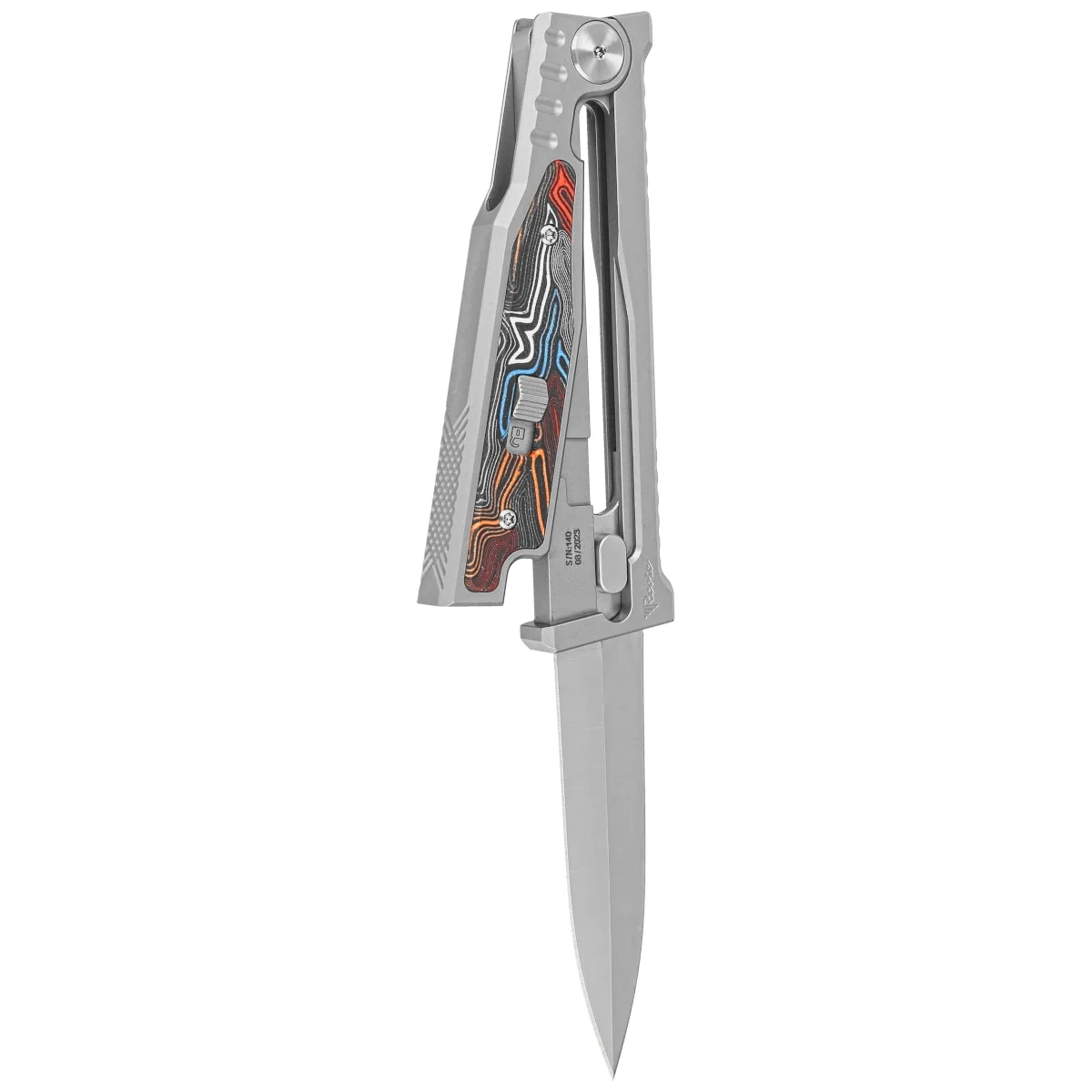 EXO-M Gravity D/E Bead Blasted Titanium/Damascus MultiColor G10, Satinto intuicyjne otwierany, pomysłowy nóż składany EXO-M (Medium) z legendarnej manufaktury Reate Knives - prawdziwy popis inżynierów w dziedzinie projektowania. Model EXO-M wyposażono w głownią wysuwaną z przodu, aktywowaną siłą grawitacji. Konstrukcja inspirowana jest grawitacyjnym nożem lotniczym Luftwaffe, potocznie nazywanym nożem niemieckich spadochroniarzy. Intuicyjne wysuwanie i wsuwanie ostrza jedną ręką, odbywające się pod wpływem siły ciężkości oraz zastosowanie najwyższej klasy materiałów tworzą całość o niezrównanej jakości charakterystycznej dla marki Reate.