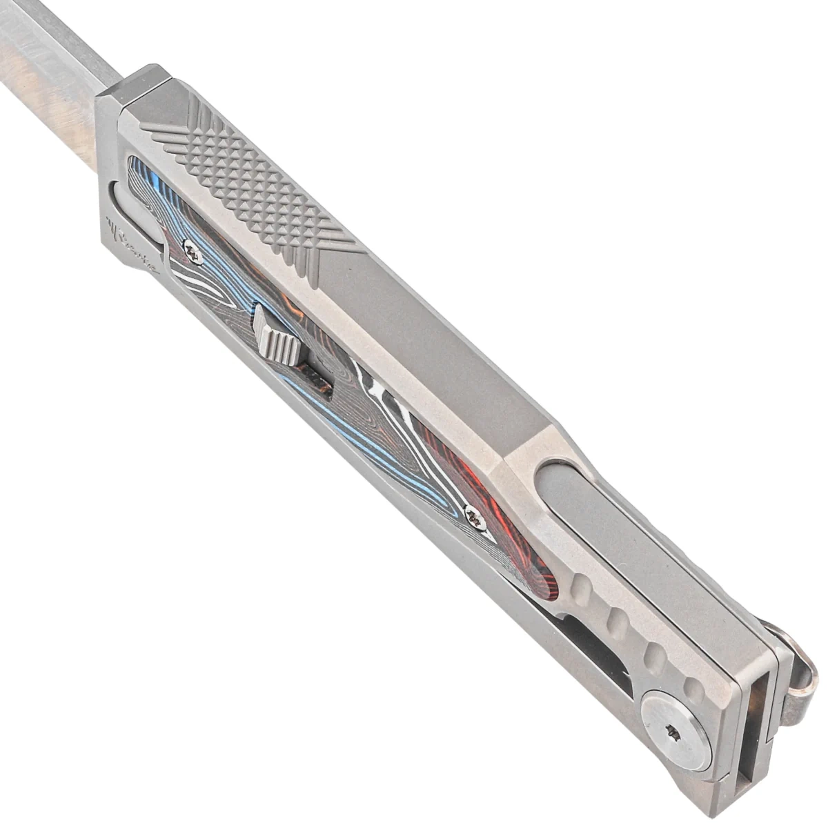 Materiał rękojeści: 6AL4V Titanium with Damascus G10 Inlay