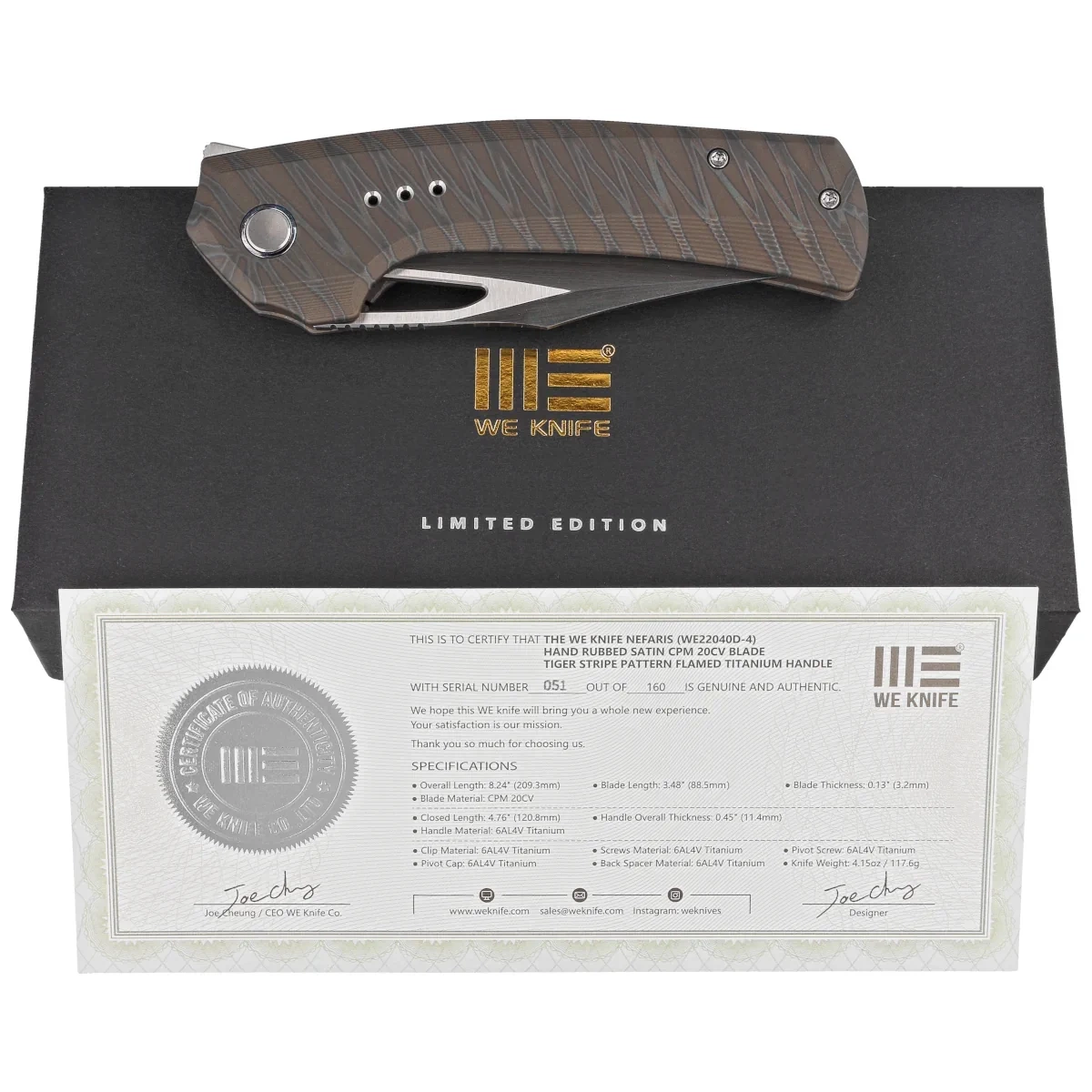 Nóż składany WE Knife Nefaris LE No 051/160 Tiger Stripe Titanium, Hand Rubbed Satin CPM 20CV (WE22040D-4)