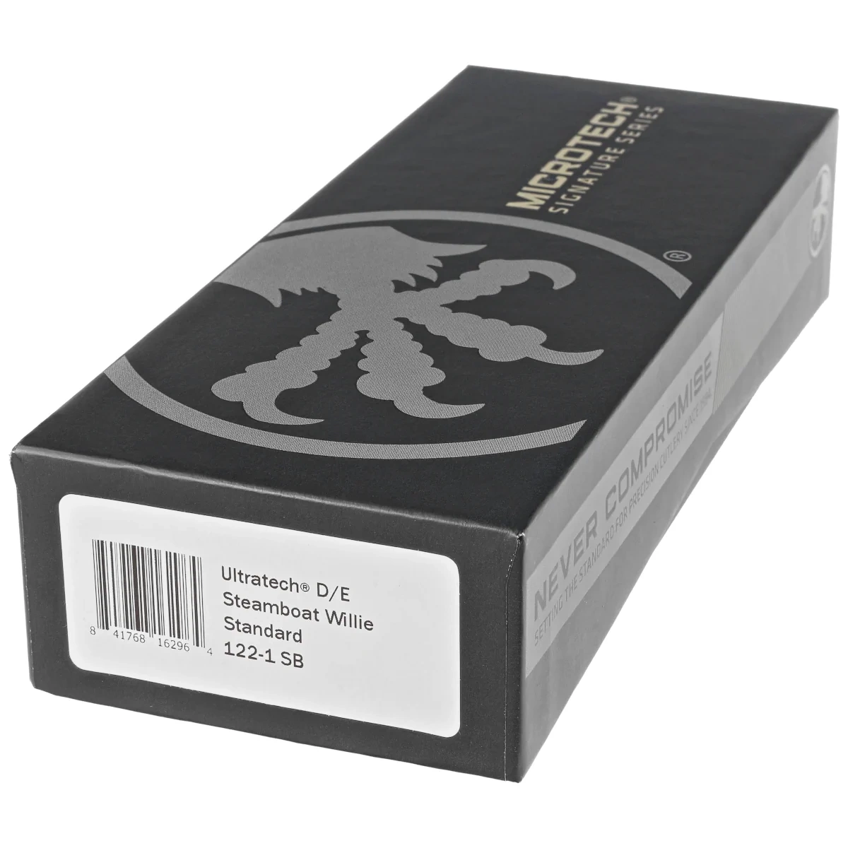 Ultratech D/E Steamboat Willie Signature Black Aluminium, Antique White to pełnowymiarowy nóż automatyczny OTF (Out The Front) z serii Ultratech SignatureWyposażony w piekielnie szybki mechanizm wysuwający ostre jak brzytwa ostrze w efektownym wykończeniu Two-Tone. W 100% wyprodukowany i zmontowany w USA. Projekt Anthony'ego Marfione, knifemakera i właściciela Microtech Knives. W hołdzie klasycznym, czarno białym filmom Disneya, utrzymany w konwencji pierwszego dystrybuowanego filmy reżyserowanego przez Walta Disneya, "Steamboat Willy" gdzie mogliśmy zobaczyć najpopularniejszą postać wytwórni, Myszkę Miki, pięknie wygrawerowaną na rękojeści noża.