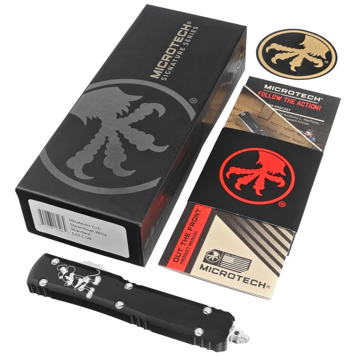 Nóż automatyczny OTF Microtech Ultratech D/E Steamboat Willie Signature Black Aluminium, Antique White M390 by Tony Marfione (122-1SB)
