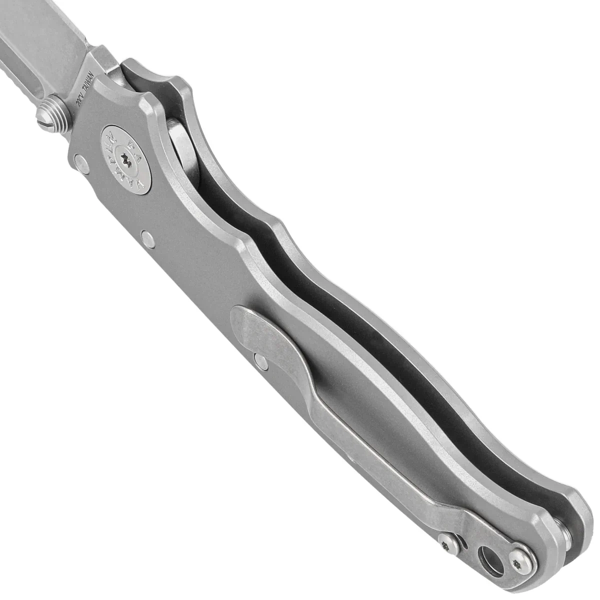 Rękojeść - wykonana z tytanu 6AL4V o lekko szorstkiej fakturze, którego fazowane krawędzie okładek eliminują ostre krawędzie dla wygody, a wykonane z przodu podcięcie na palec (fore finger groove) poprawia pewność uchwytu. Jednopozycyjny, prawostronny klips umożliwia przenoszenie noża w pozycji tip-up, czubkiem ostrza ku górze. W zestawie dodawany jest klips dla leworęcznych.