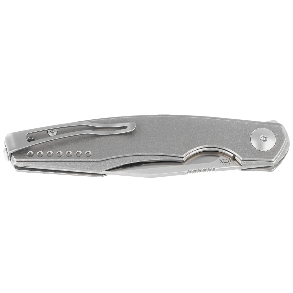 Rękojeść - z litego tytanu 6AL4V wykończonego metodą stonewashed. Konturowanie okładek eliminuje ostre krawędzie. Okładziny połączono ze sobą przy pomocy tytanowego backspacera. Klips jednopozycyjny (prawa), z tytanu, umożliwia przenoszenie noża w pozycji tip-up. Pod klipsem lanyard hole, otwór do mocowania linki zabezpieczającej lub ozdobnej.