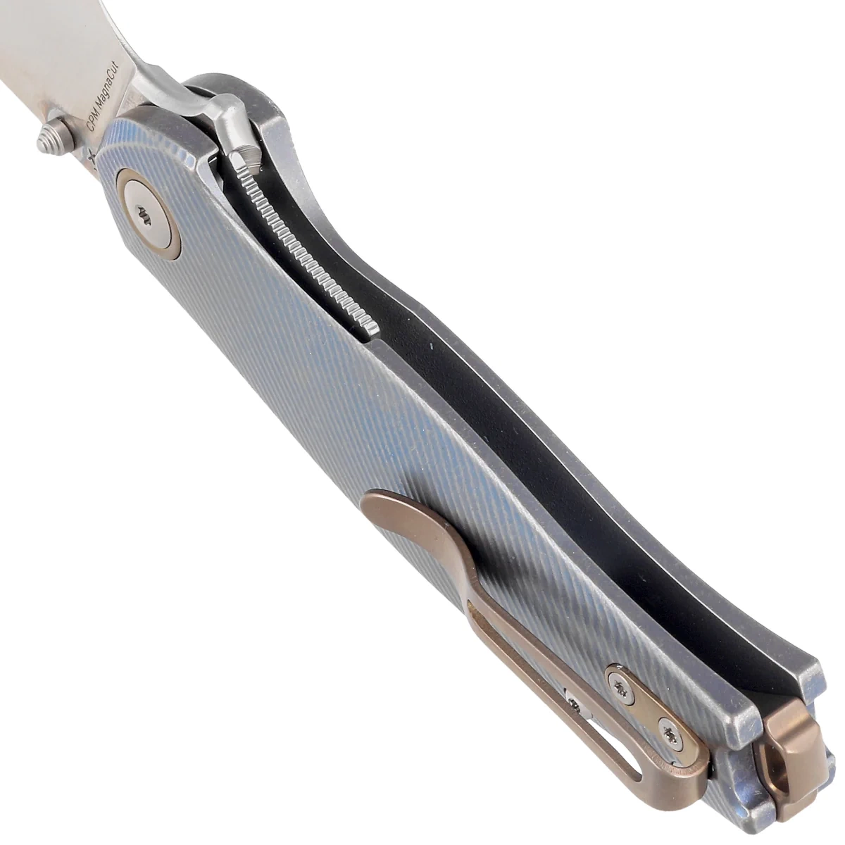 Rękojeść - okładziny z piaskowanego tytanu, kunsztownie frezowane, aby uzyskać fakturę na rękojeści. Połączone ze sobą przy pomocy frezowanego obrabiarkami CNC backspacera, dzięki czemu nóż zachowuje pożądaną sztywność konstrukcji. Backspacer oraz ozdobny pierścień wokół pivota tzw. pivot collar wykonano z tytanu anodyzowanego na brąz. Wykonane z przodu podcięcie na palce (fore finger groove) poprawia pewność uchwytu, tworząc jednocześnie z flipperem gardę zapobiegającą ześlizgnięciu się dłoni na ostrze. Prawostronny, jednopozycyjny tytanowy klips deep carry, pozwala przenosić dyskretnie nóż w pozycji tip-up (czubkiem do góry). Na końcu rękojeści lanyard hole, otwór na linkę.