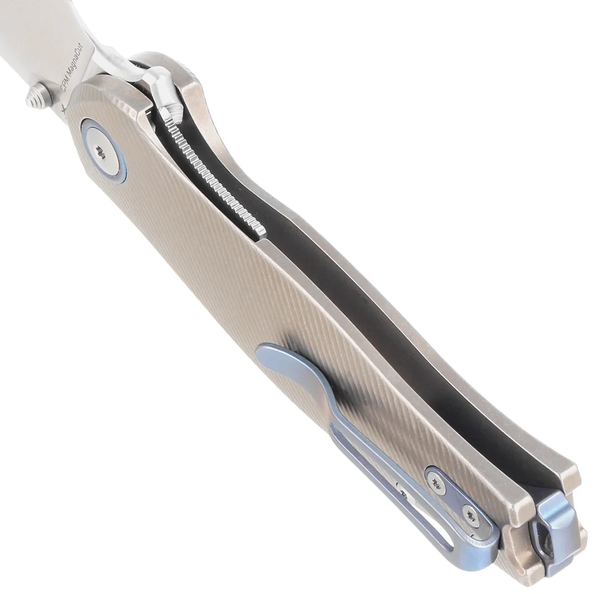 Rękojeść - okładziny z piaskowanego tytanu, kunsztownie frezowane, aby uzyskać fakturę na rękojeści. Połączone ze sobą przy pomocy frezowanego obrabiarkami CNC backspacera, dzięki czemu nóż zachowuje pożądaną sztywność konstrukcji. Backspacer oraz ozdobny pierścień wokół pivota tzw. pivot collar wykonano z tytanu anodyzowanego na niebiesko. Wykonane z przodu podcięcie na palce (fore finger groove) poprawia pewność uchwytu, tworząc jednocześnie z flipperem gardę zapobiegającą ześlizgnięciu się dłoni na ostrze. Prawostronny, jednopozycyjny tytanowy klips deep carry, pozwala przenosić dyskretnie nóż w pozycji tip-up (czubkiem do góry). Na końcu rękojeści lanyard hole, otwór na linkę.