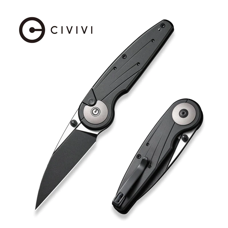Rękojeść - w kolorze czarnym. Wykonana z polerowanego aluminium, którego fazowane krawędzie okładek eliminują ostre krawędzie dla wygody, a wykonane z przodu podcięcie na palec (fore finger groove) poprawia pewność uchwytu. Otwarta konstrukcja tzw. open-backed mocowana stalowymi tulejami dystansowymi redukuję wagę oraz ułatwia czyszczenie. Oś pivota zdobi stylizowane logo marki Civivi. Dwupozycyjny, prawo/lewostronny klips deep carry pozwala przenosić dyskretnie nóż w kieszeni w pozycji tip-up (czubkiem ostrza do góry).