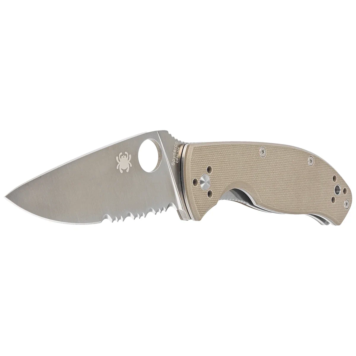 Głownia - o firmowym profilu Leaf-Shaped (kształt liścia), wykończona elegancką metodą Satin. Ostrze Combination (częściowo ząbkowane) wyprowadzono szlifem pełnym płaskim (Full Flat Grind). Powiększone 14 mm okrągłe wycięcie SpyderHole (patent Spyderco) ułatwia otwarcie foldera zimnymi lub mokrymi dłońmi. Karbowany fragment grzbietu głowni, rampa (spine jimping) daje solidne podparcie dla kciuka co ułatwia operowanie nożem. Całość blokowana jest sprawdzoną blokadą Liner Lock.