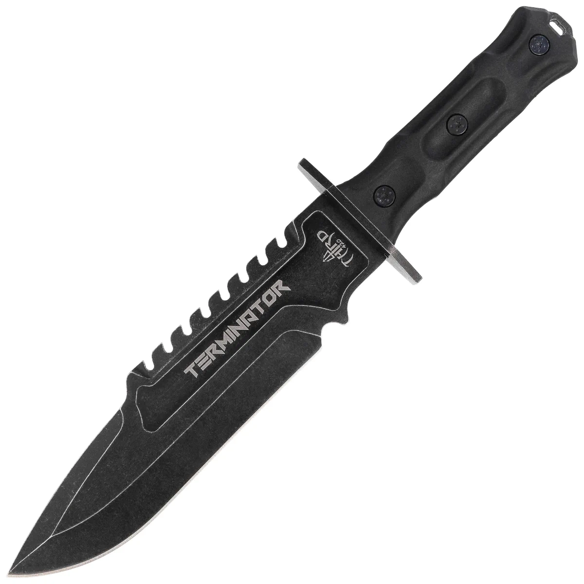 - Terminator Black Rubberized ABS, Stonewashed – solidny nóż użytkowy o taktycznej estetyce, z głownią ze stali nierdzewnej 420 i ergonomicznie ukształtowaną rękojeścią z gumowanego ABS-u. Funkcjonalny, trwały i gotowy na wymagające zadania terenowe.