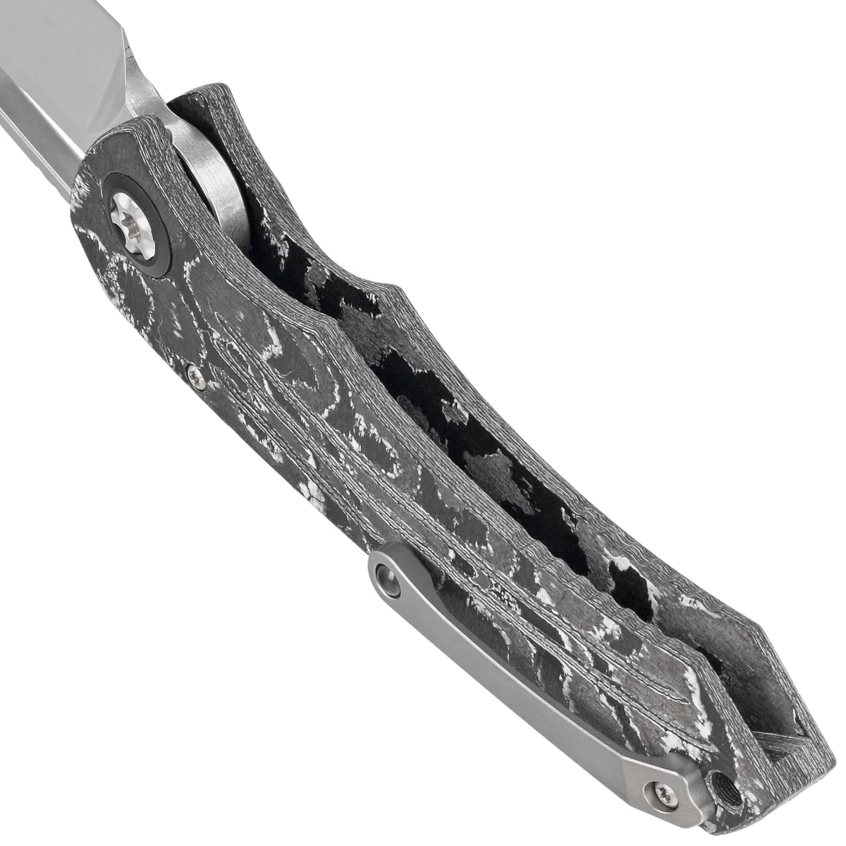 Rękojeść - precyzyjnie wykonana na frezarkach CNC z White Camo Carbon Fiber, faktura powierzchni sprawia, że nóż nie ślizga się w dłoni podczas użytkowania. Na krawędziach rękojeści znajdują się nacięcia (jimping) poprawiające uchwyt. Oś pivota ozdobiona designerską śrubą i ozdobnym pierścieniem wokół pivota tzw. pivot collar. Frezowany, jednopozycyjny (prawa) tytanowy klips typu deep carry pozwala przenosić nóż w pozycji tip-up. Wyposażony w gładką kulkę rollerball, dzięki której nóż z łatwością wsuwa się do kieszeni nie niszcząc brzegów kieszeni.