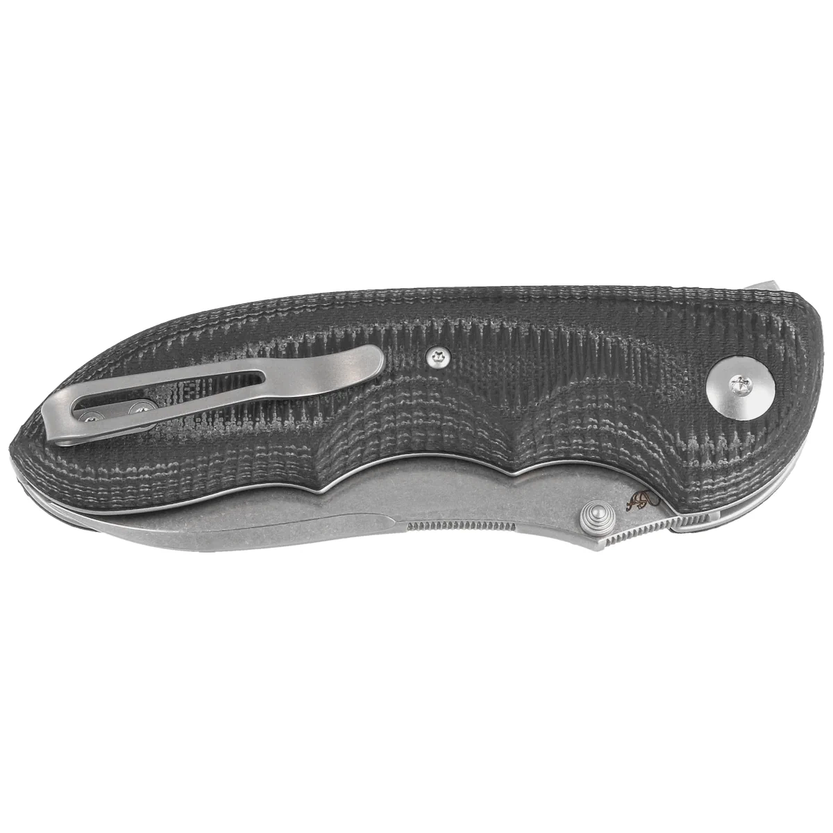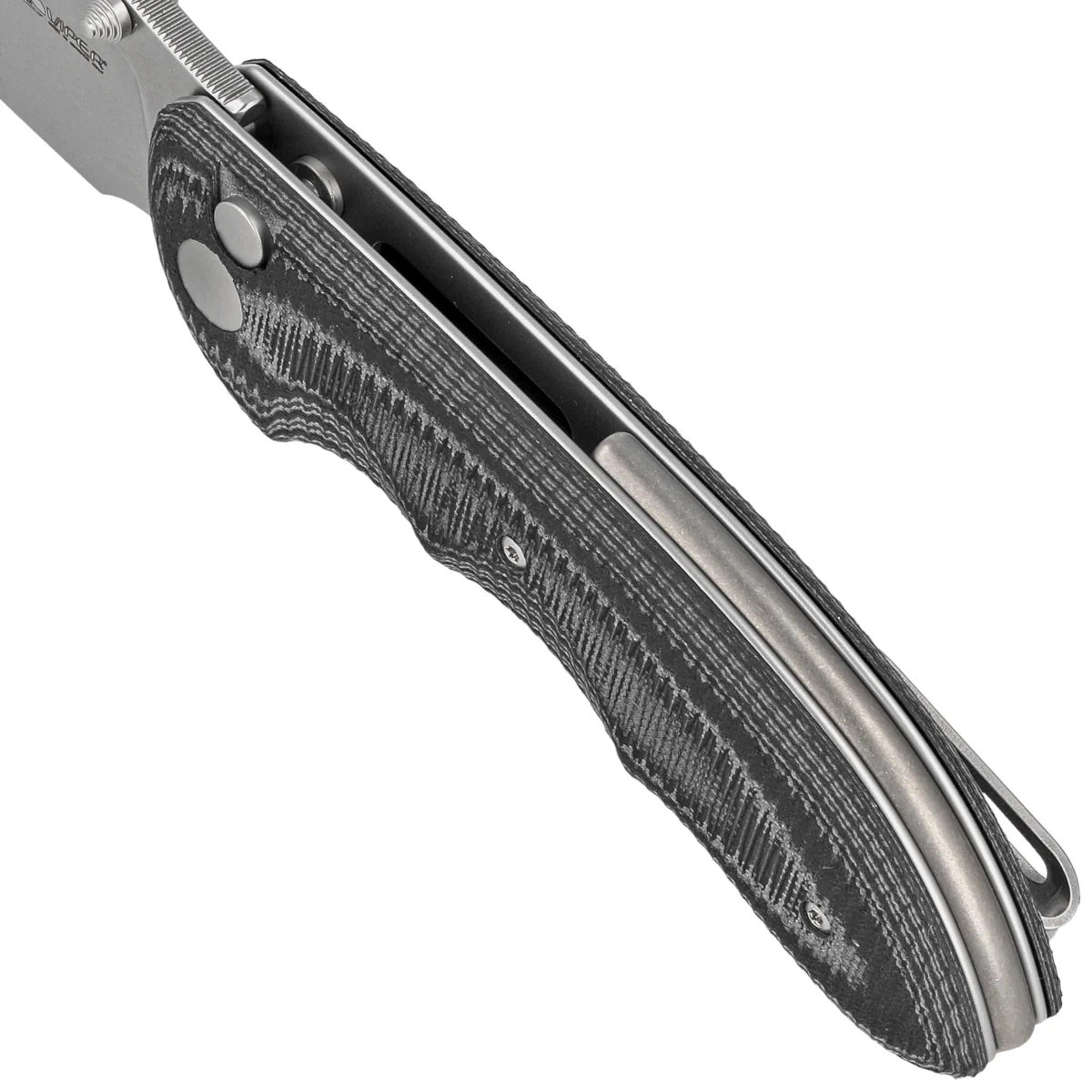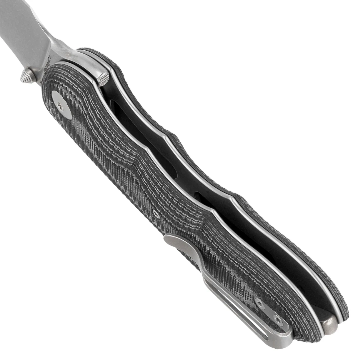 Rękojeść - okładziny z innowacyjnego kompozytu Suretouch, połączenia G10 i gumy. Zapewniają one pewny chwyt w każdym momencie, nawet przy śliskich dłoniach. Teksturowane dla poprawienia pewności uchwytu, przykręcone do stalowej ramy noża. Tytanowy backspacer gwarantuje sztywność i wytrzymałość całej konstrukcji. Prosta, solidna budowa daje pewność wieloletniego użytkowania. Jednopozycyjny (prawa) tytanowy klips pozwala przenosić dyskretnie nóż w kieszeni w pozycji tip-up (czubkiem ostrza do góry).