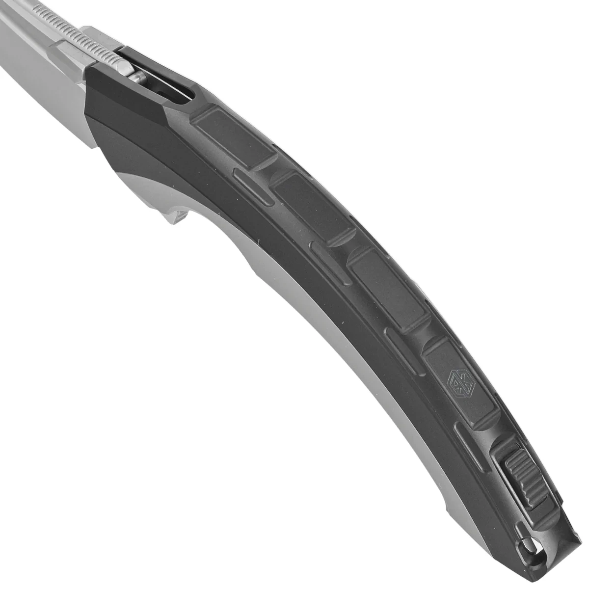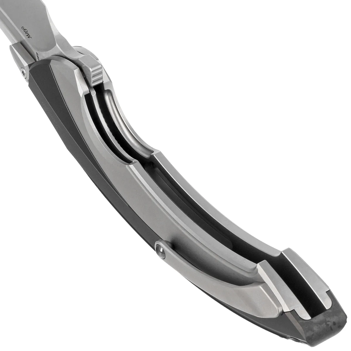 Rękojeść - egzoszkielet z tytanu 6AL4V na którym mocowana jest monolityczna obudowa pięknie frezowana przy pomocy obrabiarek CNC z jednego kawałka tytanu. Innowacyjna konstrukcja zapewnia wybitną solidność i odporność. W tylnej części znajdziemy suwak blokady, dzięki niemu mamy możliwość zdejmowania zewnętrznej obudowy np. aby wyczyścić nóż. Jednopozycyjny (prawa) klips deep carry wyposażony w gładką kulkę rollerball, dzięki której nóż z łatwością wsuwa się do kieszeni nie niszcząc jej brzegów, pozwala przenosić dyskretnie nóż w kieszeni w pozycji tip-up (czubkiem ostrza do góry).