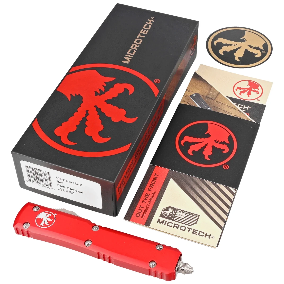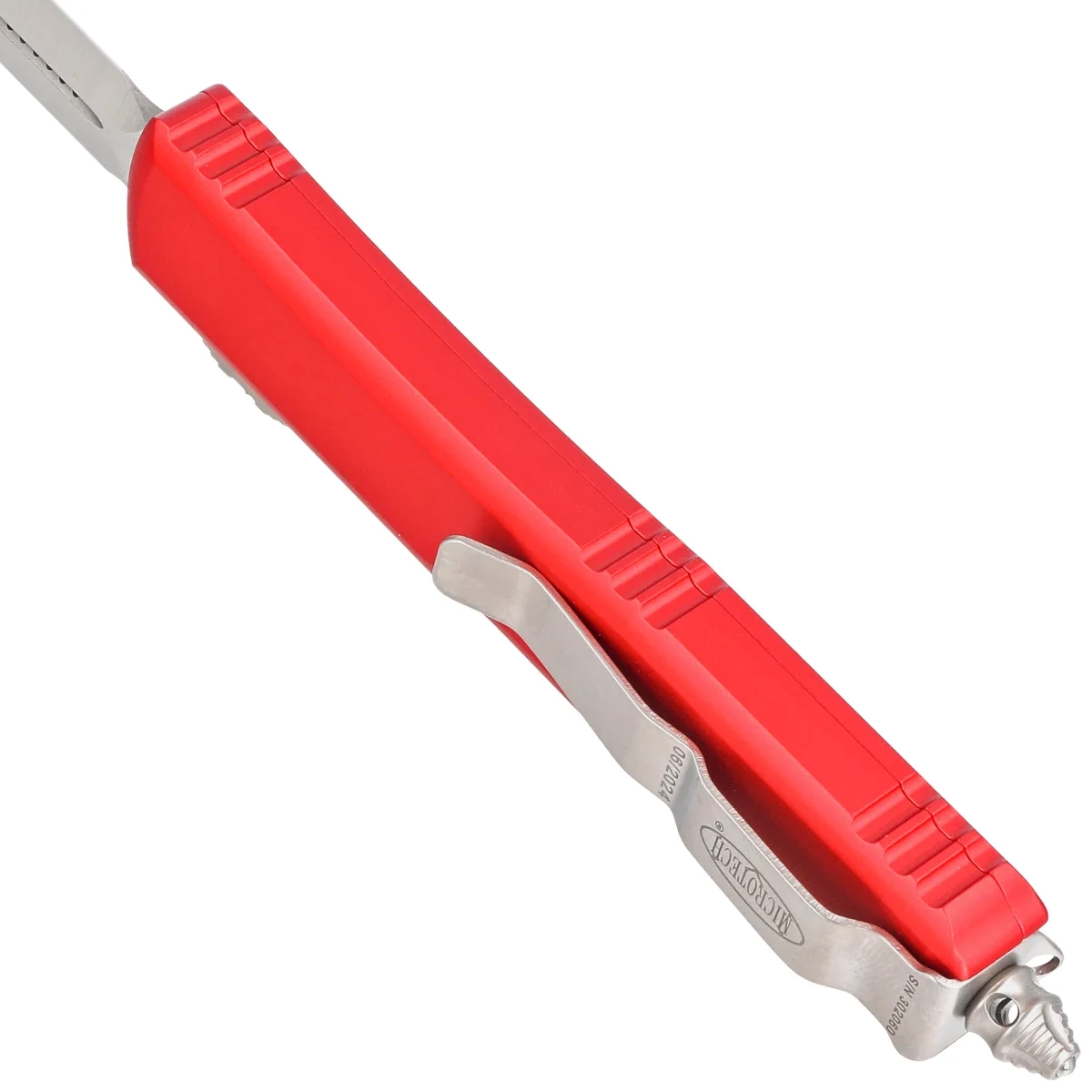 Ultratech D/E Red Aluminium, Satin to pełnowymiarowy nóż automatyczny OTF (Out The Front) z serii Ultratech. Wyposażony w piekielnie szybki mechanizm wysuwający ostre jak brzytwa ostrze double edge w efektownym wykończeniu Satin. W 100% wyprodukowany i zmontowany w USA. Projekt Anthony'ego Marfione, knifemakera i właściciela Microtech Knives.
