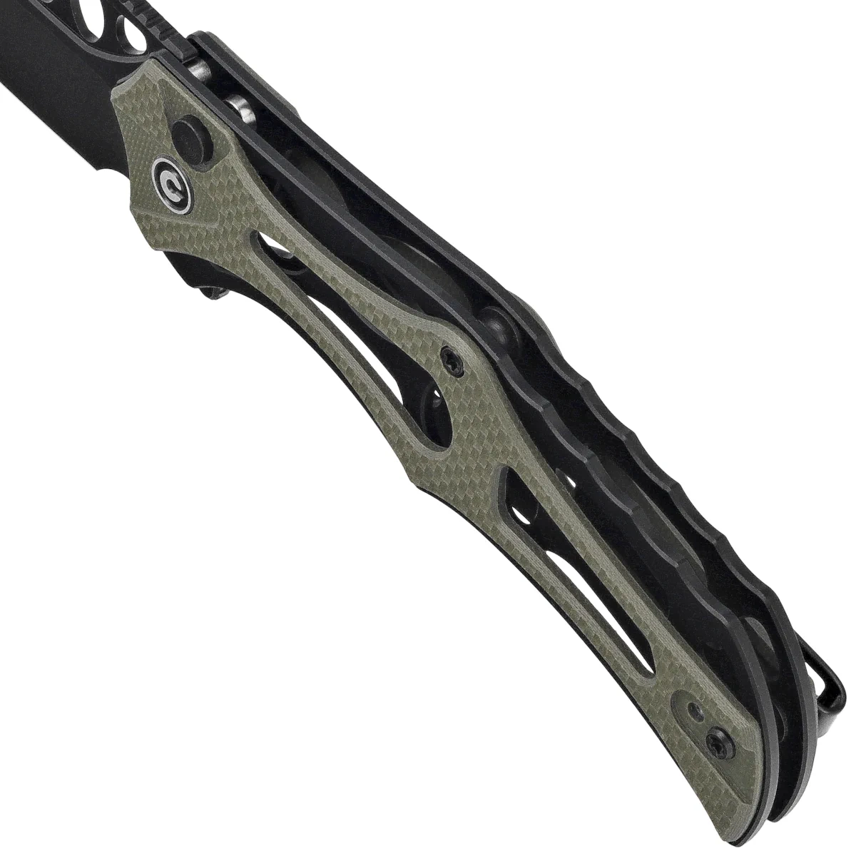 Rękojeść - szkieletowa, z aluminium, do którego przykręcono mocno powycinane okładziny z kompozytu G10. Dzięki temu palce mają dużo punktów podparcia dla pewnego chwytu. Wykonane z przodu podcięcie na palec (fore finger groove) poprawia ergonomię. Otwarta konstrukcja tzw. open-backed mocowana stalowymi tulejami dystansowymi redukuję wagę oraz ułatwia czyszczenie. Prosta, pewna budowa daje pewność wieloletniego użytkowania. Dzięki tym wszystkim zabiegom konstrukcyjnym pełnowymiarowy folder osiąga oszałamiającą wagę 75g. Oś pivota zdobi stylizowane logo marki Civivi. Dwupozycyjny (prawa/lewa), klips deep carry pozwala przenosić dyskretnie nóż w kieszeni w pozycji tip-up (czubkiem ostrza do góry).