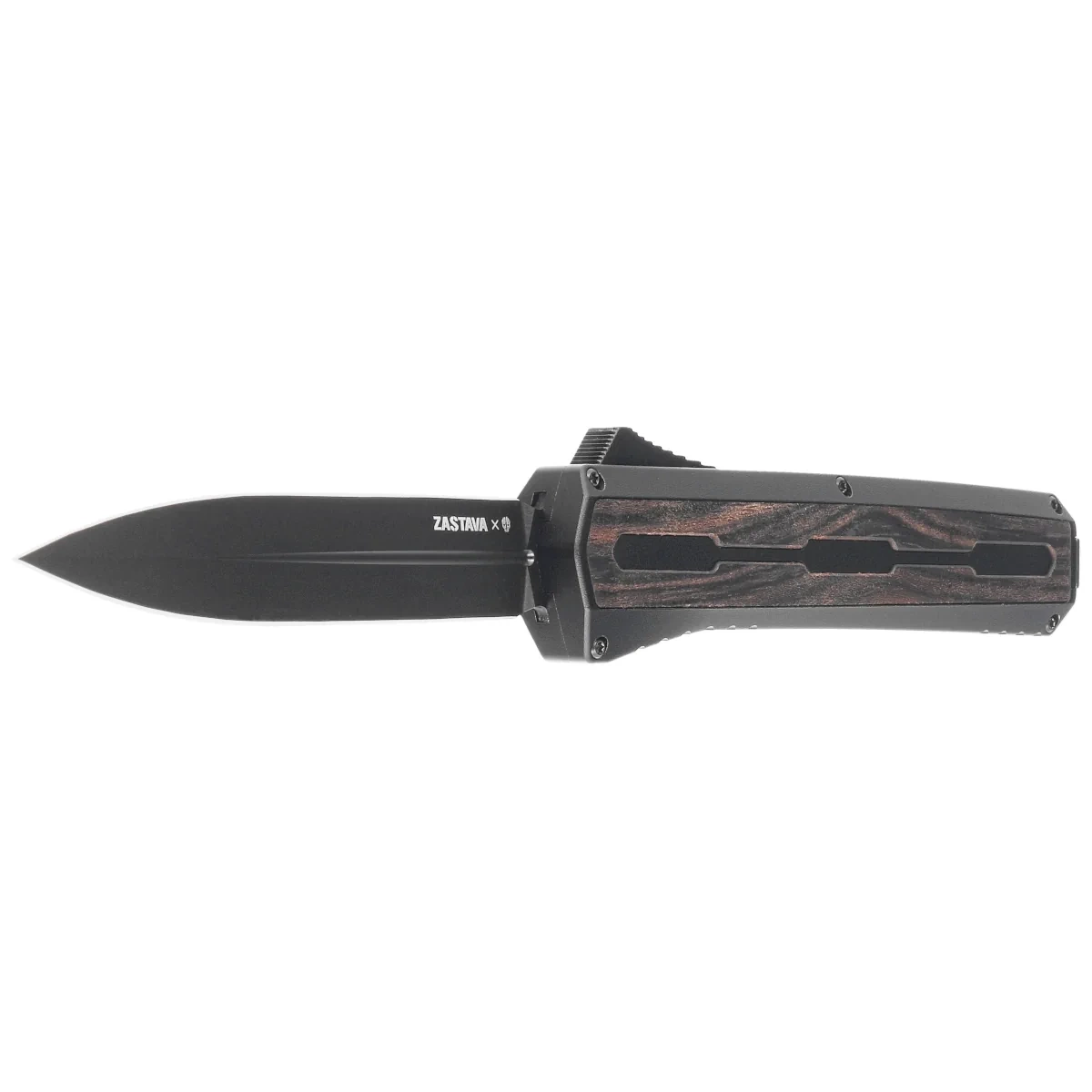 - A7 Zastava D/E Black Aluminium/Tactical Black Wood, Black taktyczny nóż OTF wykonany we współpracy z Zastava Arms czerpie inspirację z kultowego karabinu Zastava M70. Rękojeść z aluminium i drewna. Ostrze stal S35VN pokryta czarną powłoką na bazie tytanu.
