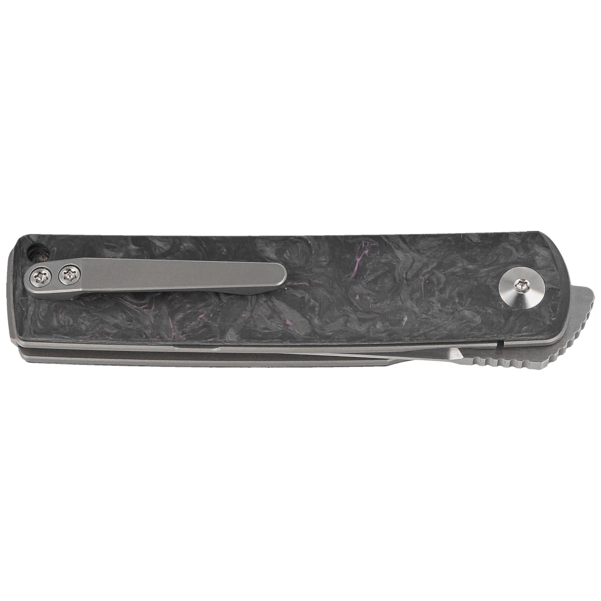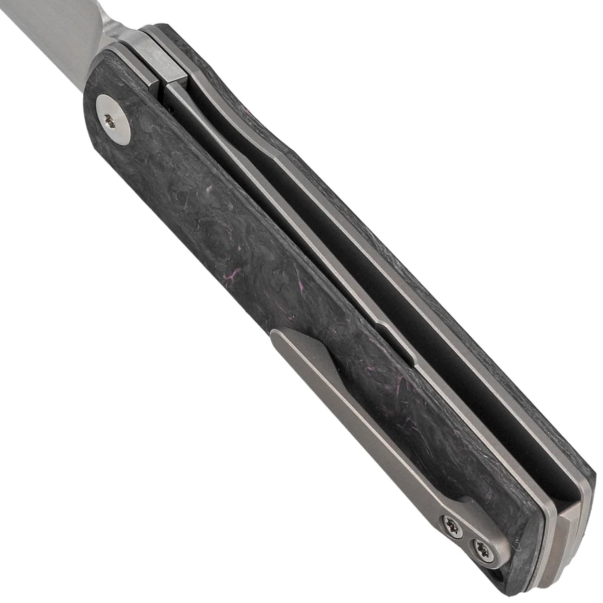 Rękojeść - szkielet z tytanu 6AL4V do którego przymocowano okładki z kompozytu Dark Matter Purple Fat Carbon. Konturowanie okładek eliminuje ostre krawędzie. Tylko nieliczne firmy są w stanie wykonać rękojeść z tak nieprawdopodobną dokładnością! Okładziny połączono ze sobą przy pomocy tytanowego backspacera pokrytego upper jimpingiem. Klips jednopozycyjny (prawa), z tytanu, umożliwia przenoszenie noża w pozycji tip-up.